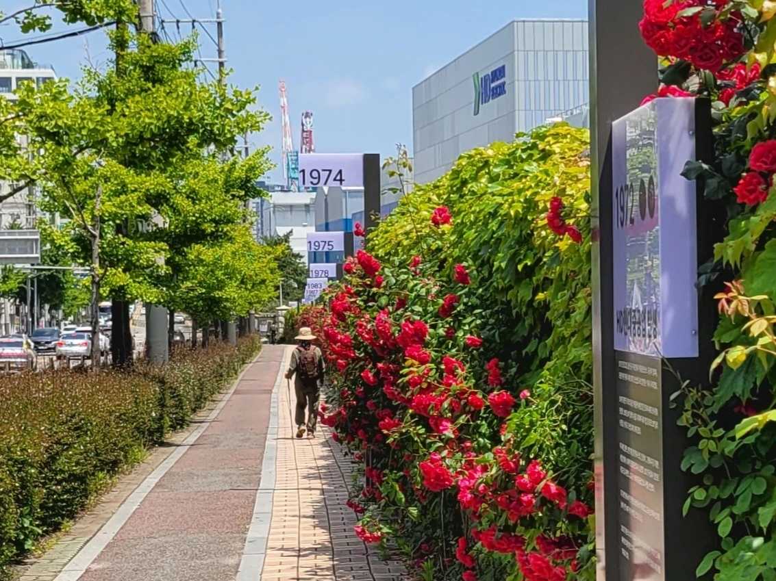 담쟁이덩굴과 덩굴장미로 덮인 현대중공업 담장에 설치된 산업역사 문화거리 안내판은 1972년부터 현재까지 동구 발전에 기여한 기업, 노동자, 주요 시설물에 대해 소개한다.