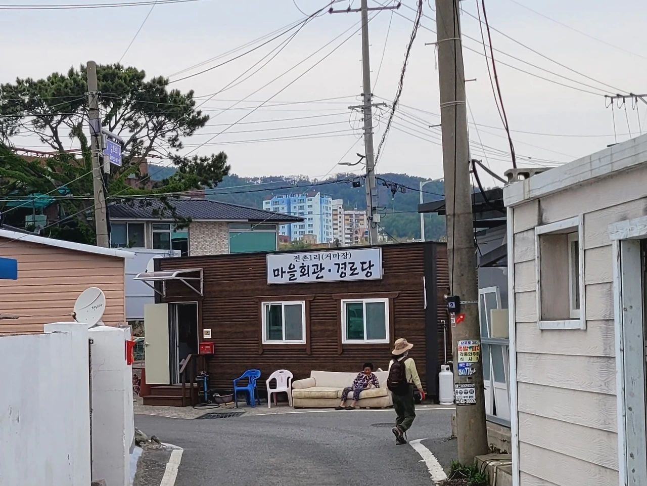 산길을 벗나니 감포해수욕장이 시작된다. '감포'라는 유명세에 비하면 해수욕장을 볼품이 없다. 전촌 1리, 전동리를 지나면 감포리다. 갈수록 마을은 커진다. 멀리 높은 건물도 보인다. 경로당 앞의 할머니는 손주 대신 고양이를 어른다.