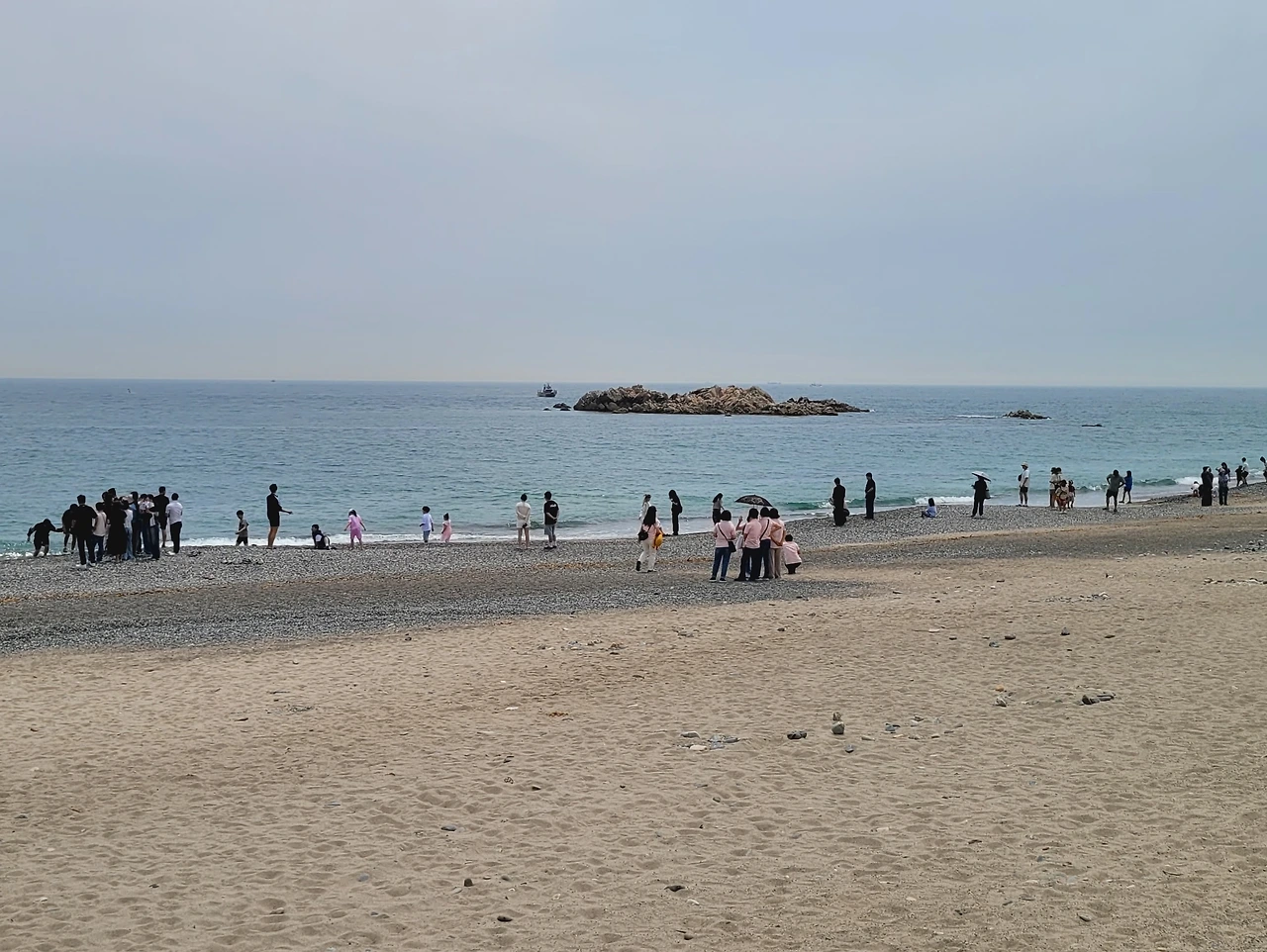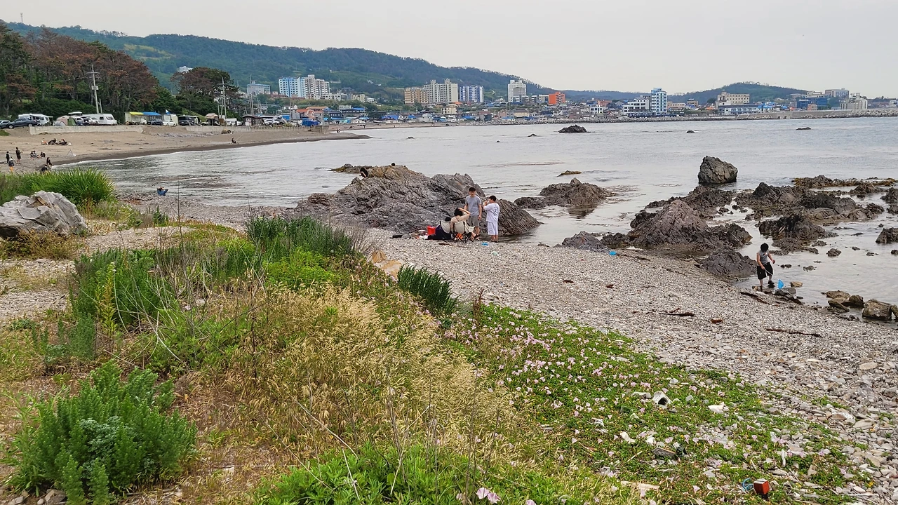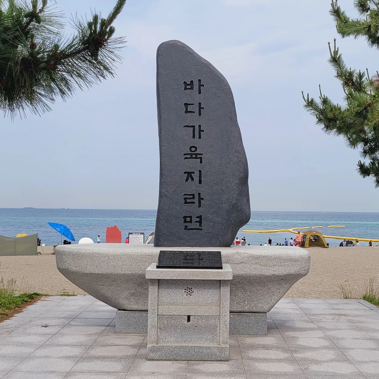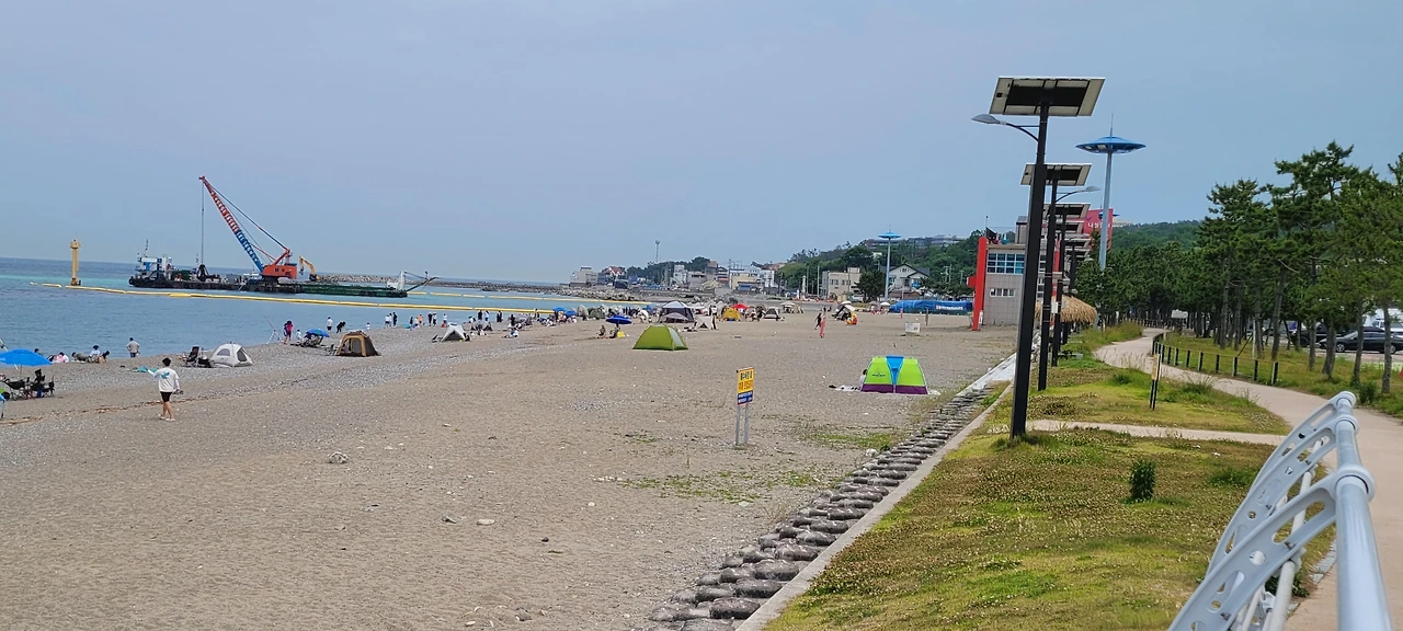 소나무 숲의 넓은 오토캠핑장과 산뜻한 산책로 앞에 펼쳐진 고운 모래 백사장이 돋보이는 해수욕장이다. 이름도 고운모래해변으로 변경했다. 모래가 고운만큼 물도 맑다. 바다 한쪽에 준설선이 떠있다. 모래가 아니라 몽돌을 준설하고 있다.