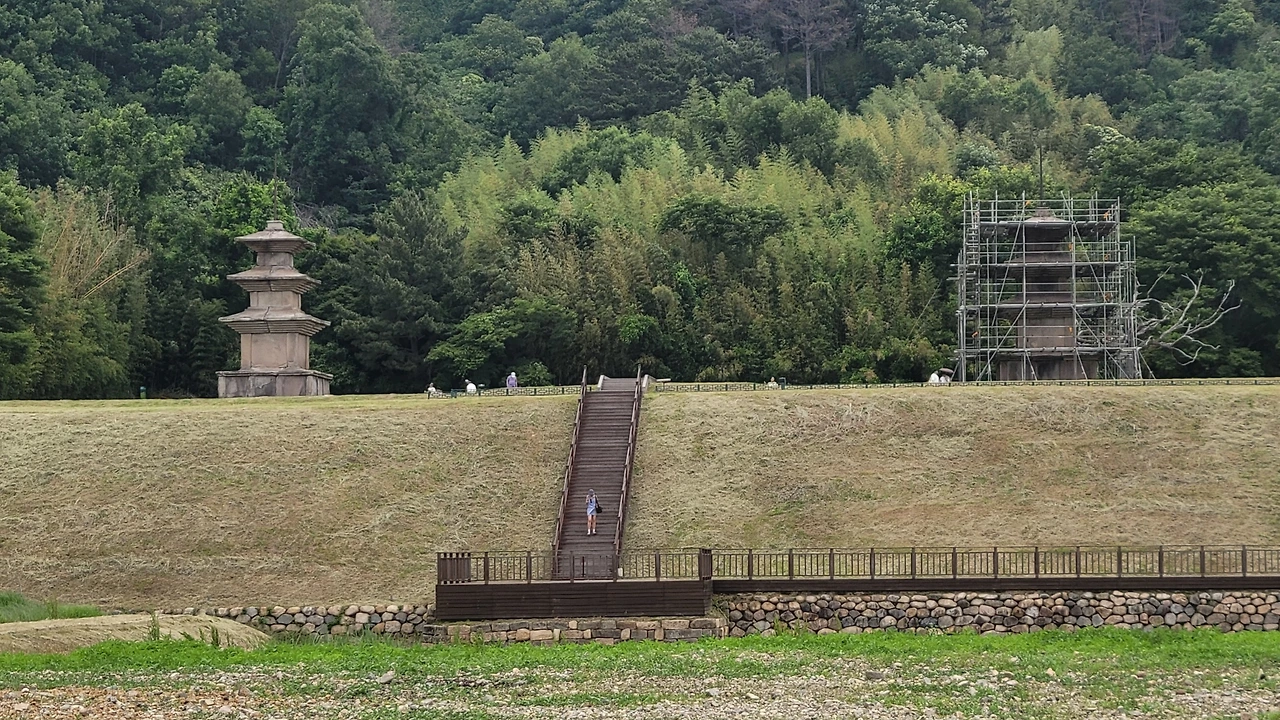 문무대왕면 용당리. 이곳에는 삼층석탑 두 기와 금당, 강당 등의 건물 터만 남아 있다. 감은사는 금당, 강당, 중문이 한 줄로 배치되어 있다. 감은사의 법당은 동해 용왕이 드나드는 집, 용당이라 했다. 법당인 금당 밑에는 석축이 들려 있다. 동해의 용이 된 문무왕이 쉽게 드나들 수 있도록 만든 배수 시설이다. 금당 앞에 동서로 두 기의 삼층석탑이 있다. 건축 연대가 확실한 통일신라 초기의 석탑이다.