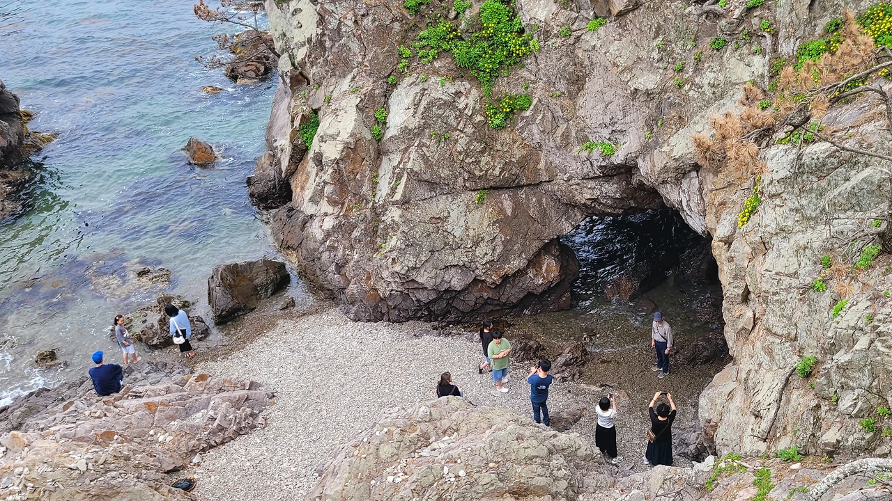 파도와 바람과 시간이 만든 자연 조각품, 해식동굴 ‘용굴’이 모습을 드러낸다. 휴일을 맞아 탐방객이 많다. 아이와 함께, 노부부가 함께, 젊은 연인이 함께 용굴 앞에서 인증샷을 남긴다. 한참 기다려 겨우 사진 찍을 기회를 잡는다.