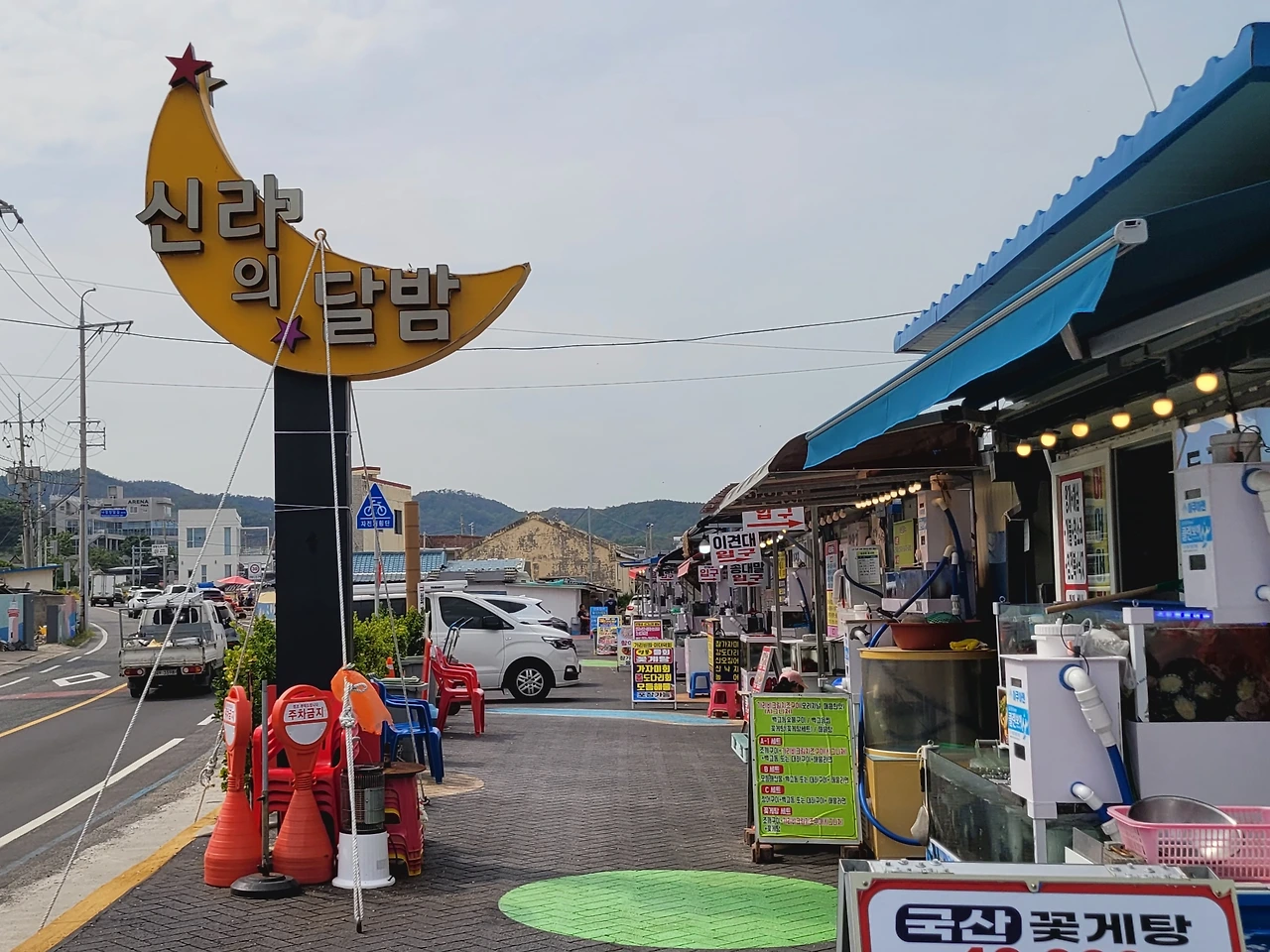 '신라의 달밤'이란 조형물이 눈길을 끈다. 나정고운모래해변 들머리, 31번 국도와 해안 방조제 사이에 생긴 일명 포장마차촌이다. 상호가 이색적이다. 모든 집이 안압지, 이견대, 송대말, 반월성, 포석정 등 경주의 역사유적지를 지명을 사용한 간판이 일렬종대로 서 있다. 메뉴만 보아도 군침이 돈다. 꽃게탕, 해물탕, 산낙지, 참가자미, 강도다리, 문어숙회, 바다가육지라면 . . . . . .