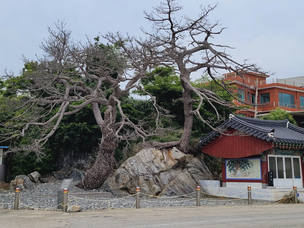 뱃머리가 정면으로 보이는 곳에 자그마한 제당이 있다. 제당 옆 바위틈을 뚫고 용틀임하듯 하늘을 향한 두 그루의 소나무. 400년 동안 가곡마을을 지키는 당목이다. 마을 사람들은 할배 할매 소나무라 부른다. 음력 6월 1일과 어선이 출어할 때 안전과 풍어를 기원하는 나무이기도 하다.
