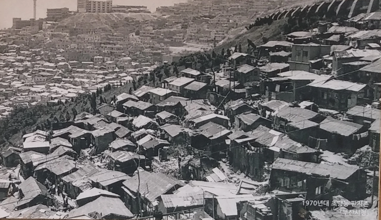 1970년대 영주동과 초량동, 왼쪽 위의 높은 건물이 디지털고등학교다. (출처: 부산시청)