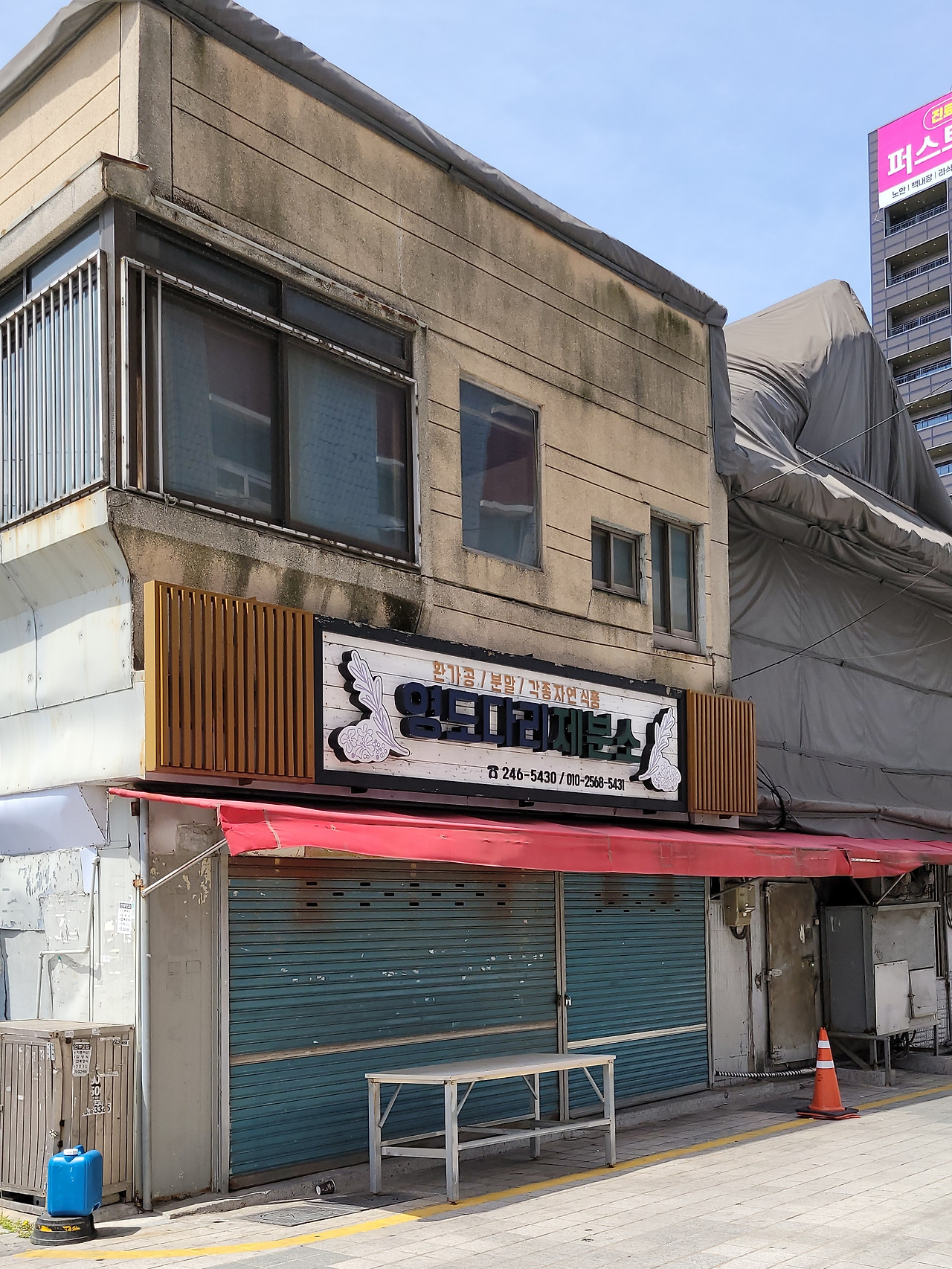 한 건물에 네 가구가 들어와 살고 있다. 산나물 상회, 국숫집, 슈퍼, 약재상으로 업종도 각각 다르다. 창틀이 변형되어 집집마다 조금씩 다른 것이 인상적이다.아마 건물 주인이 각각 다를 것으로 추정해 본다. 가덕도 외양포의 적산가옥과 같이.