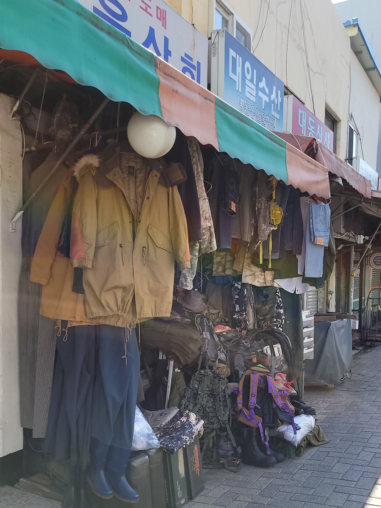 자갈치 시장에는 어시장만 있는 것이 아니다. 자갈치시장 입구부터 노선버스가 다니는 자갈치로를 따라 군용 물품과 청바지를 파는 가게가 모여 있었다. 해방 후 70년대까지는 고등학생들이 미군복 바지를 검은색으로 물을 들여 교복 대신 입고, 똥구두라 부르던 미군 군화를 신고 다녔다. 미군 야전 점퍼도 물들여 입었다. 그게 멋이었다. 군복, 군화를 이곳에서 샀다.