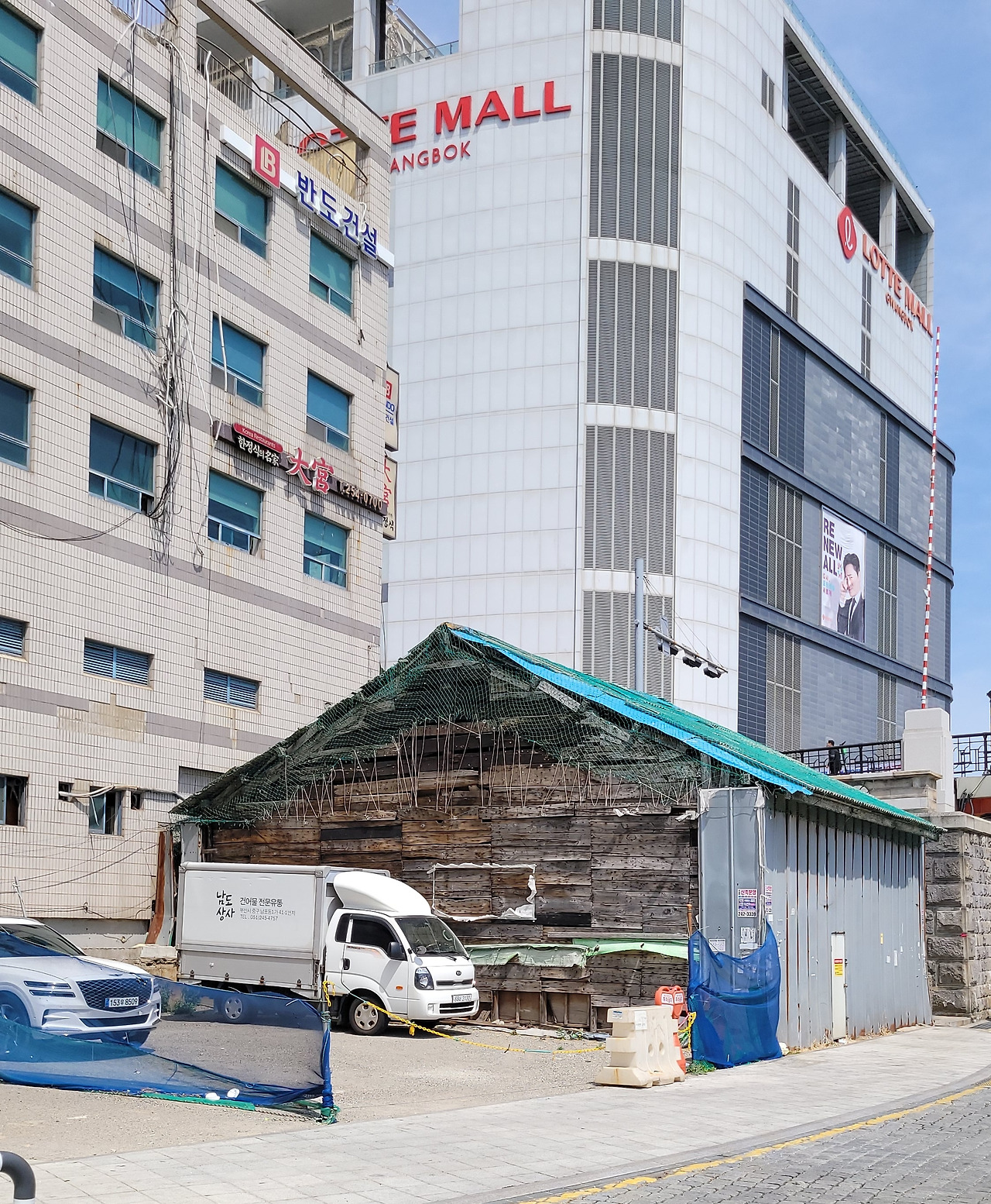 옛 소문난 대구점집 터의 허름한 창고 건물 뒤로 롯데쇼핑몰이 보인다.