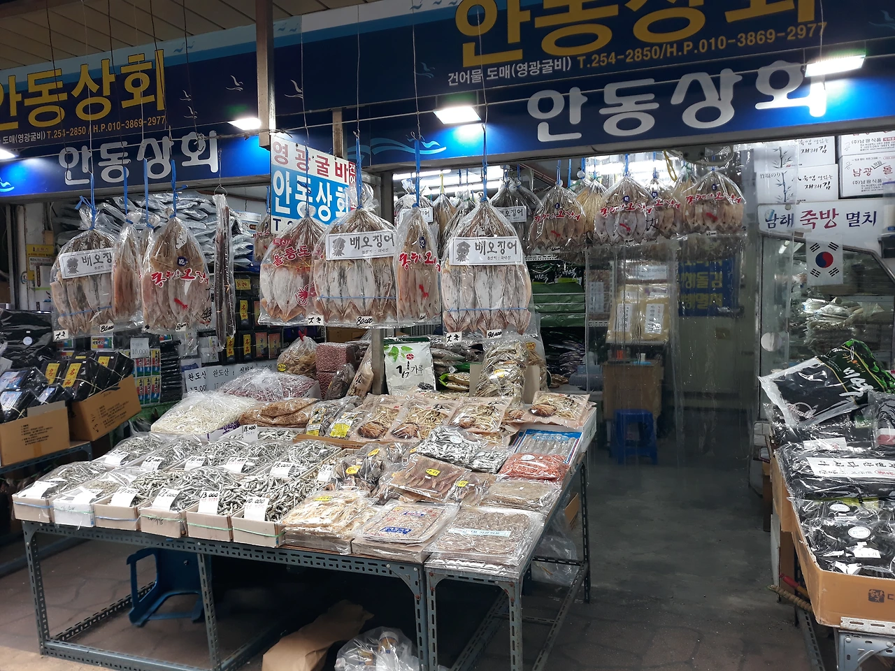 건어물 도매시장으로 들어선다. 마른 멸치, 오징어, 문어, 새우, 조개, 각종 어포, 김, 미역, 파래 등 건어물과 건해산물과 밤, 대추, 곶감, 땅콩 등 건과가 진열되어 있다. 건어물 시장에 오면 이것저것 사고 싶어 진다. 아내는 다시마, 김, 마른 멸치, 어포를 산다.