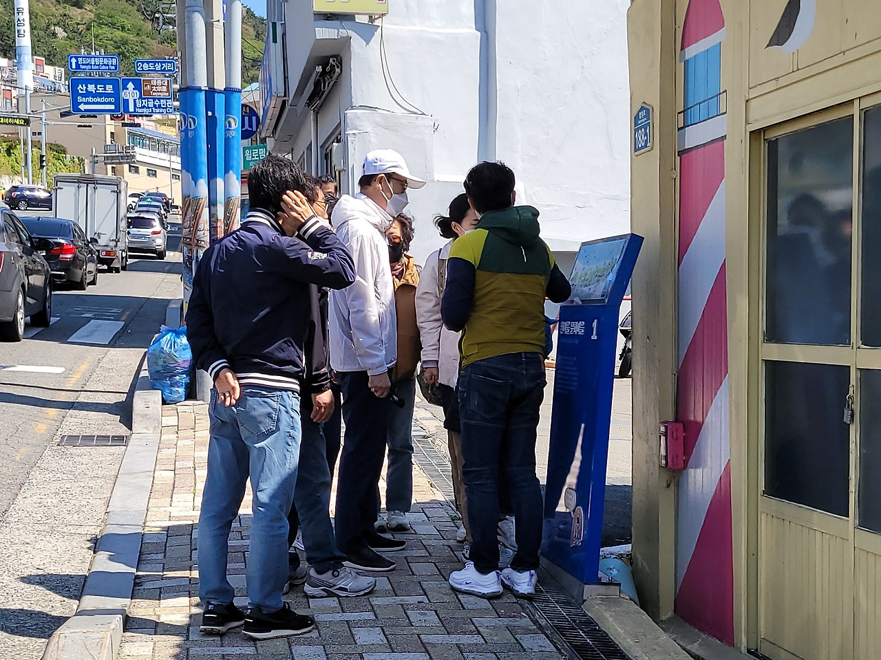흰여울문화마을 안내소 앞에 관광객이 모여 있다. 안내원이 안내지도를 보며 관광 포인트를 설명한다. 맛집도 덧붙인다.