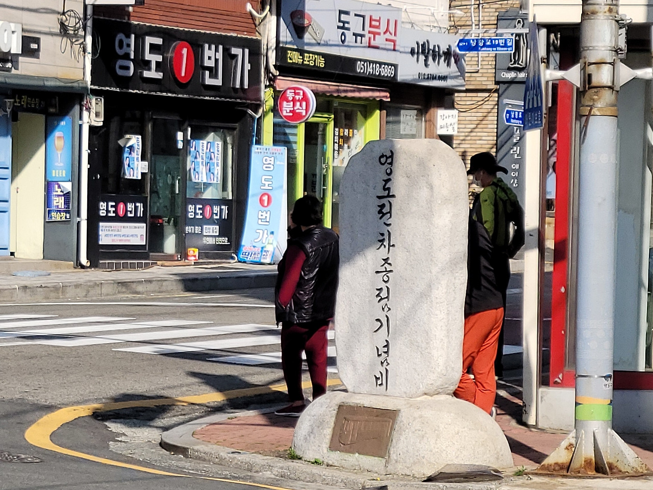 남항동 행정복지센터에서 남항로를 따라 한 블록 더 간다. 남항동 사거리에 '영도전차종점기념비'가 서 있다. 기념비 건너편이 전차가 머물던 종점 위치다.