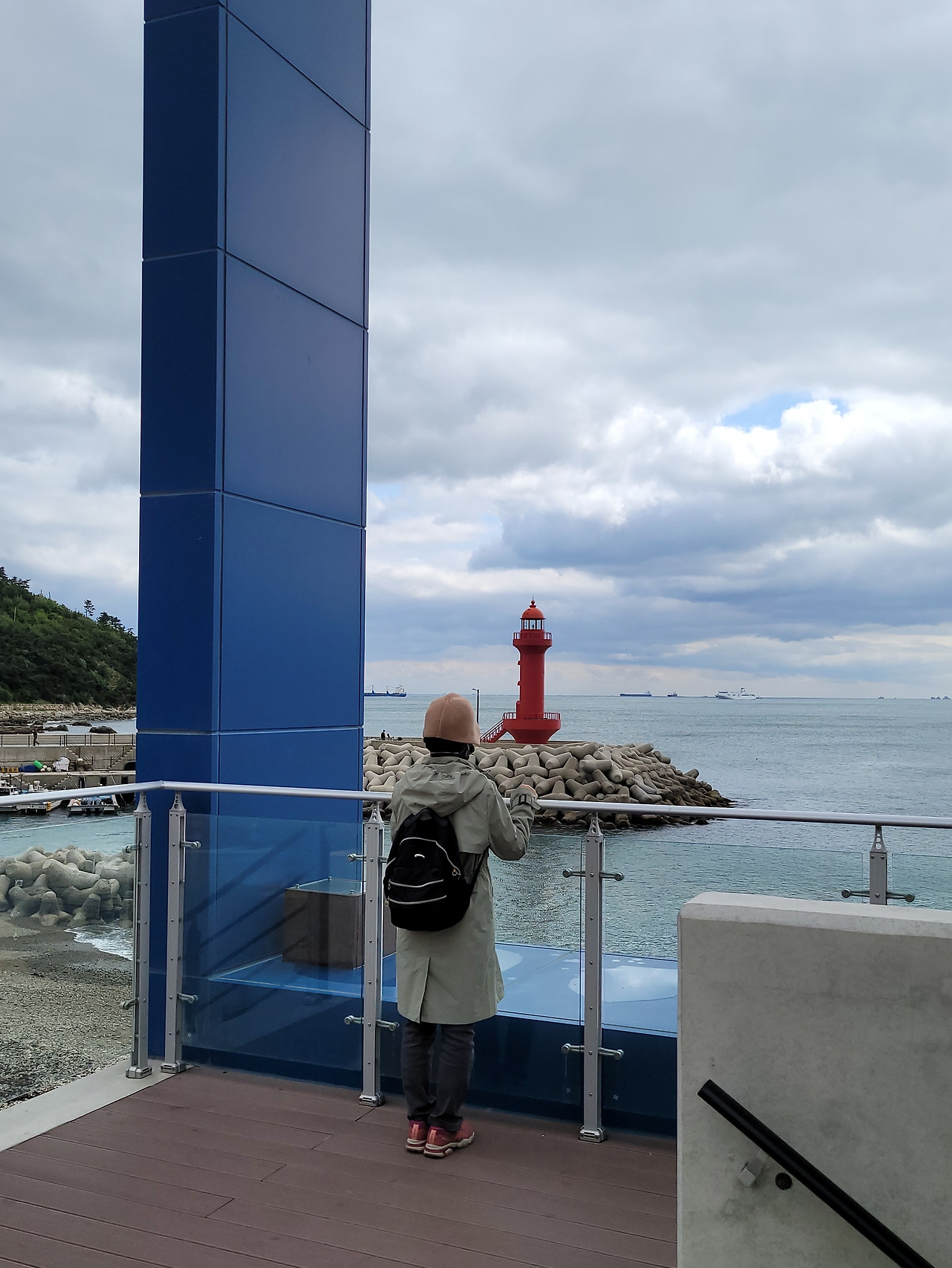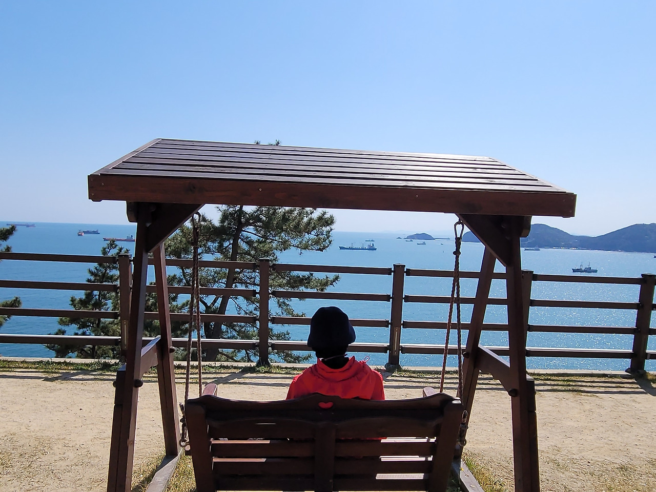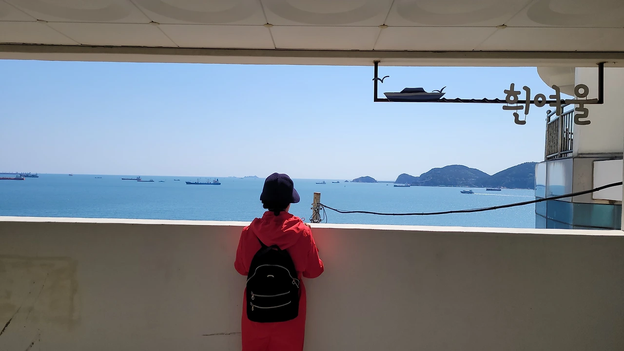 다시 절영로로 올라와 함지골을 향해 조금 걸으니 작은 쉼터가 있다. 흰여울 마을에서 멀어지는 만큼 사람도 줄어든다. 점심 도시락을 먹는다. 흔들의자에 앉아 태평양으로 열린 바다를 아무 생각 없이 바라본다. 송도해수욕장, 혈청소와 암남공원, 두도, 나무섬이 차례로 보인다. 작은 배가 하얀 물보라를 일으키면서 달린다. 큰 선박들이 같은 방향으로 멈춘 채 바다 위에 떠있다. 아래 절영산책로 자갈해안에는 파도가 밀려와서 부서진다. 포말이 일어난다.