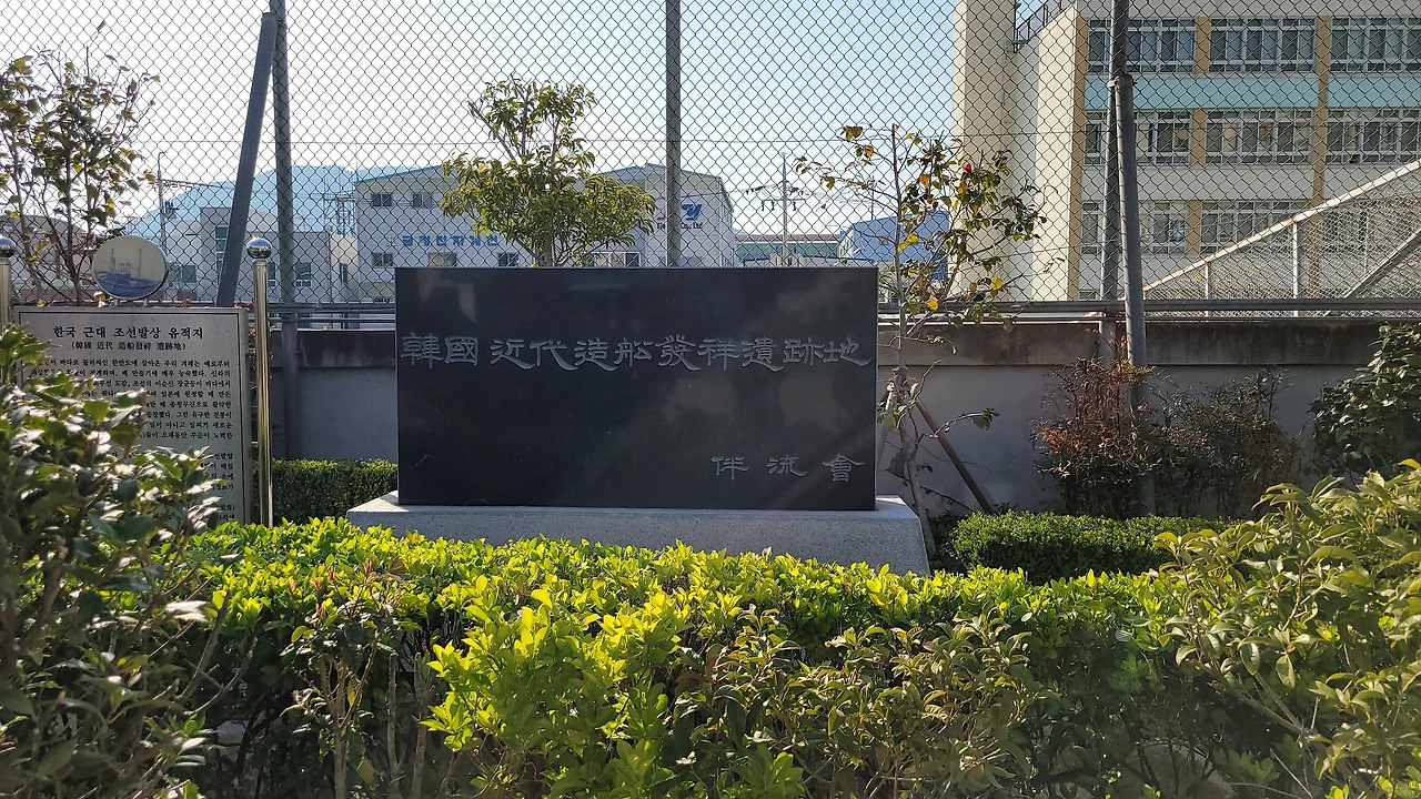 영도도서관 남항분관 건너 대평초등학교. 운동장 안쪽에 '한국 근대 조선 발상 유적지'라는 빗돌이 세워져 있다. 1912년 설립된 우리나라 최초의 근대식 조선소인 다나카 조선소가 있던 자리다. 대풍포 매립 후 지금의 우리조선 자리로 옮겨갔다.