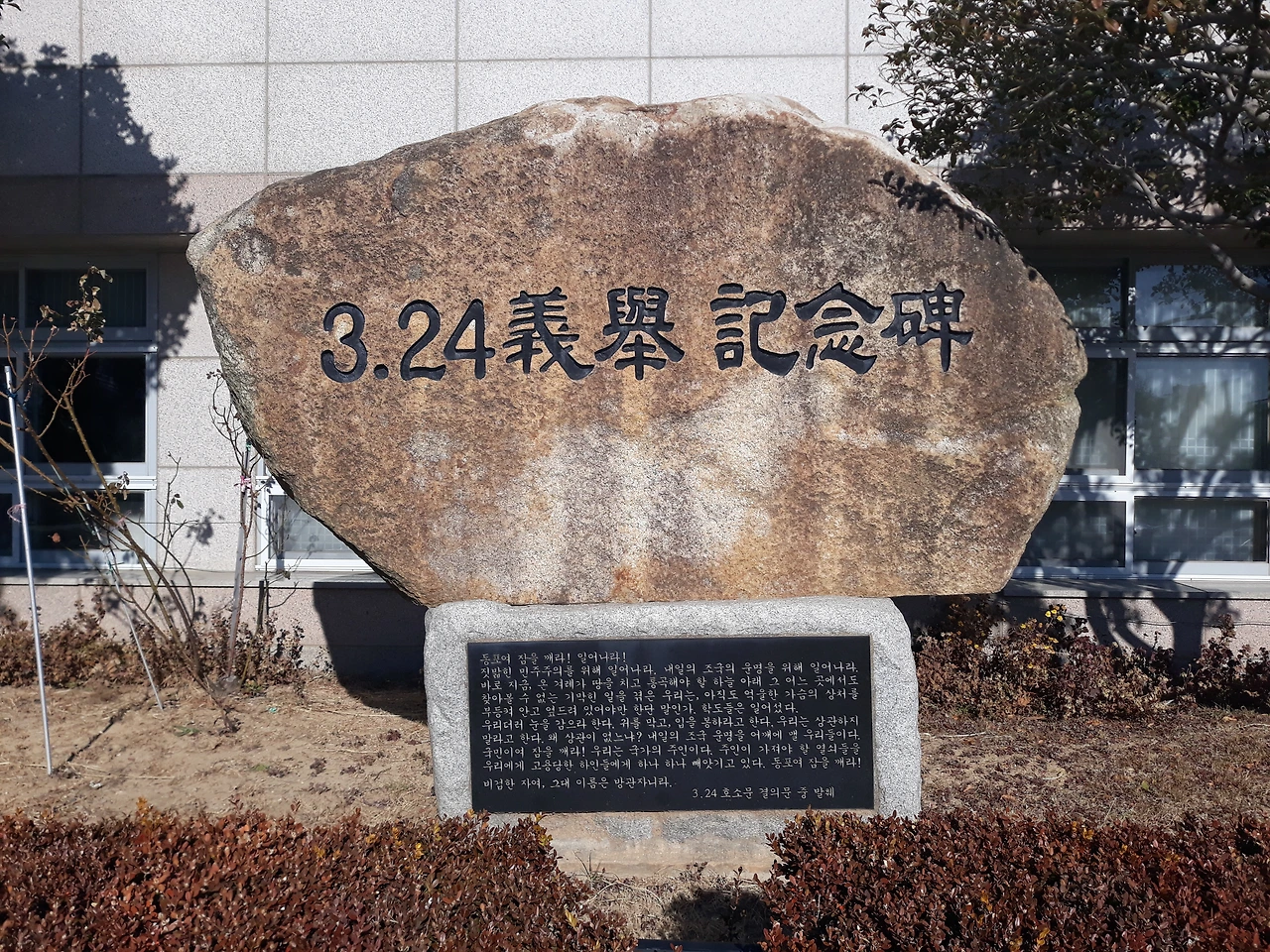 또 하나의 기념비가 서 있다. 1960년 3.24 의거 기념비다. 부산고등학교는 4.19 혁명 당시 부산 지역에서 가장 먼저 부정선거 규탄 시위를 했다. "동포여 잠에서 깨라! 비겁한 자여, 그대 이름은 방관자니라"를 외치며 부산 시위의 방아쇠를 당겼다.