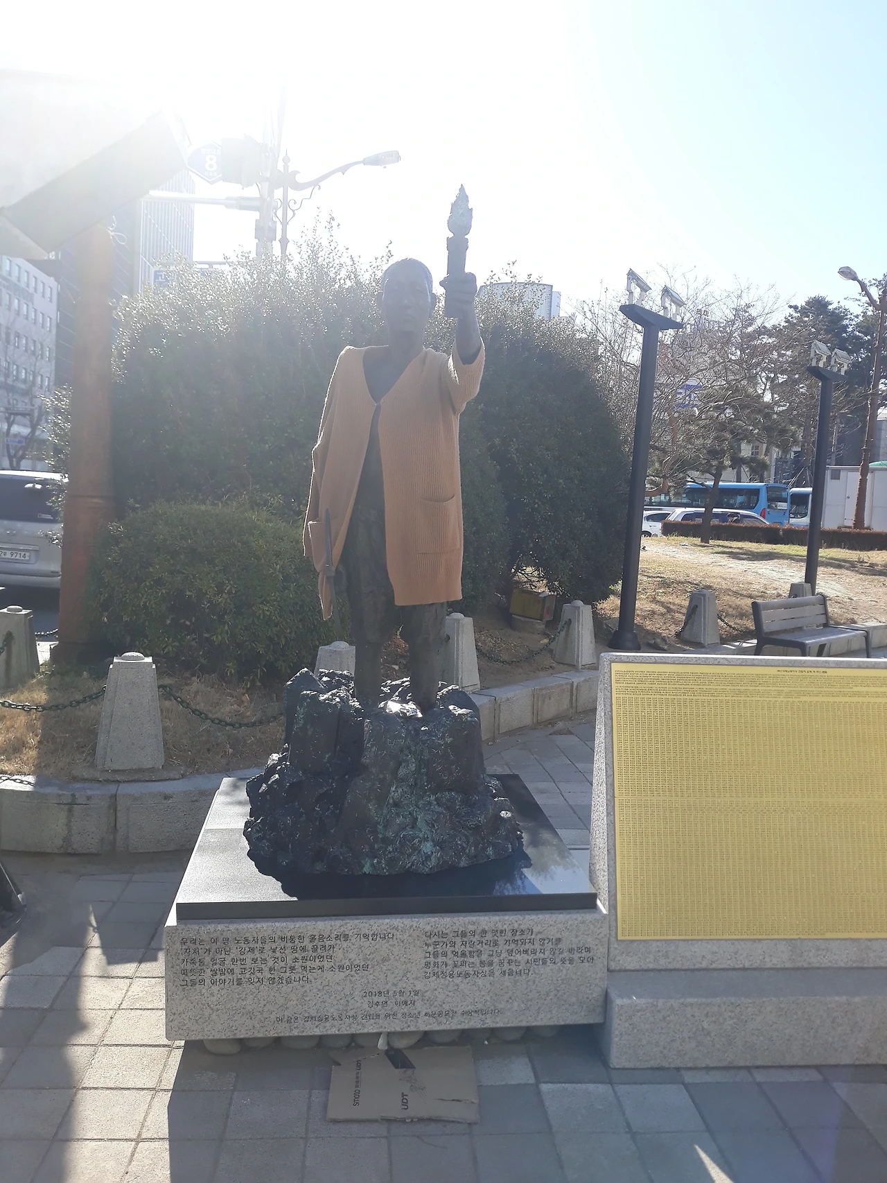 강제징용노동자상. 2018년에는 3.1운동 100주년을 맞아 '강제징용노동자상'을 세운다. 이 역시 철거와 설치를 거듭하는 우여곡절 끝에 정발 장군 동상 옆에 자리을 잡았다. 이곳은 항일 거리가 된다.