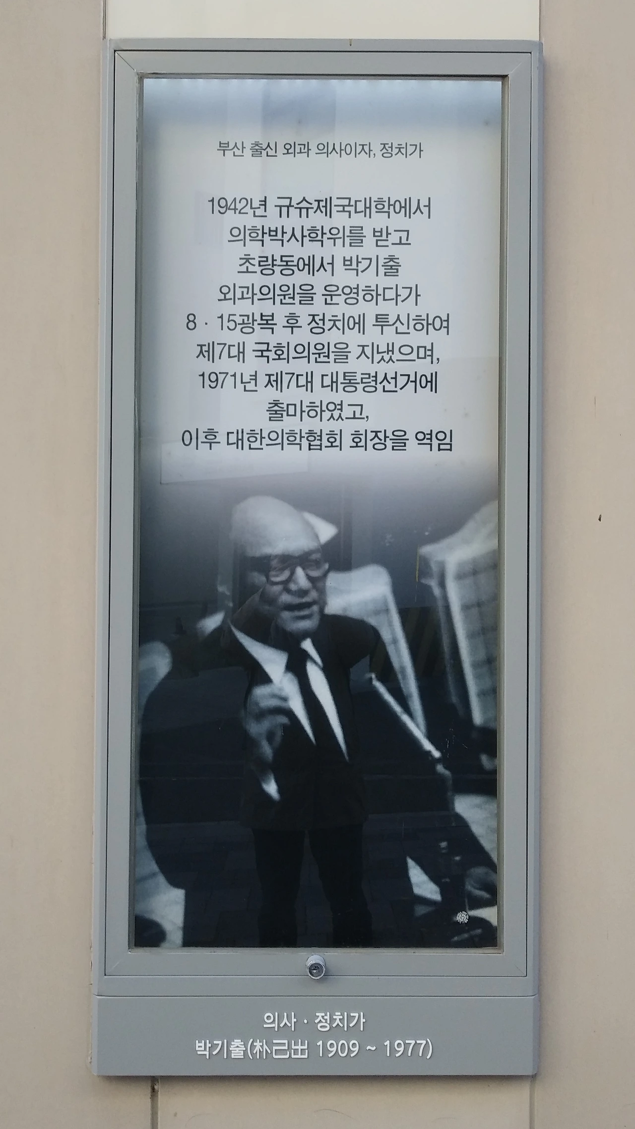 외과의사 박기출은 강한 인상을 남겼던 진보 정치인이다. 진보당 조봉암과 함께 부통령 출마를 했고, 7대 국회의원 선거에서는 신민당 공천을 받아 당선되었다. 7대 대통령 선거에 출마했으나 낙선한다. 후일 유신이 선포되자 일본으로 망명하였던 박기출은 위암에 걸려 임종 직전에 귀국하여 사망하였다. 독재 정권의 박해를 받다가 정치적 꿈을 이루지 못하고 떠난 그의 죽음을 시민들은 아쉬워했다.