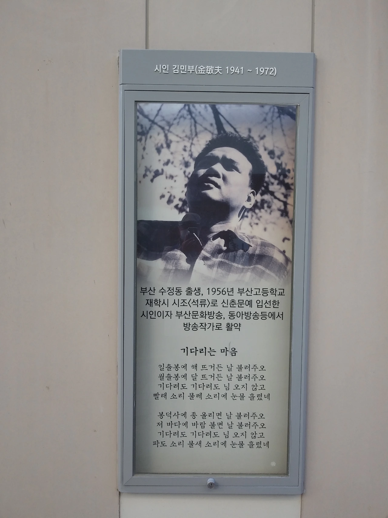 168 계단 중간쯤에 <기다리는 마음>의 작사가인 김민부 시인을 기린다. 돌아오지 못하는 사람을 기다리는 마음의 시 정서를 가장 잘 음미할 수 있는 곳이다. <기다리는 마음>은 아는데 '김민부'는 모르는 사람이 많다. 부산고 2학년 때 첫 시집 《항아리》를 펴내고, 3학년 때 한국일보 신춘문예에 시조 <균열>이 당선되어 시조 시인으로 등단한 천재 시인 김민부. 그는 부산 MBC PD로 그 유명한 <자갈치아지매>를 연출한 방송작가이기도 하다. 서울 MBC, 동아방송, TBC 등에서 방송작가로 활동하다가 뜻밖의 사고로 요절한다.