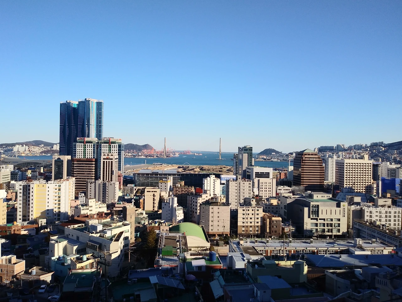 부산항 북항. 전망대에서 부산항을 바라본다. 북항대교가 정면에 보인다. 북항 재개발공사가 한창 진행 중이다. 모노레일 위쪽 승강장 부분에 또 다른 전망대가 있다. 김민부 전망대와 각도가 다르다. 같은 위치를 찍어 비교해 보자.