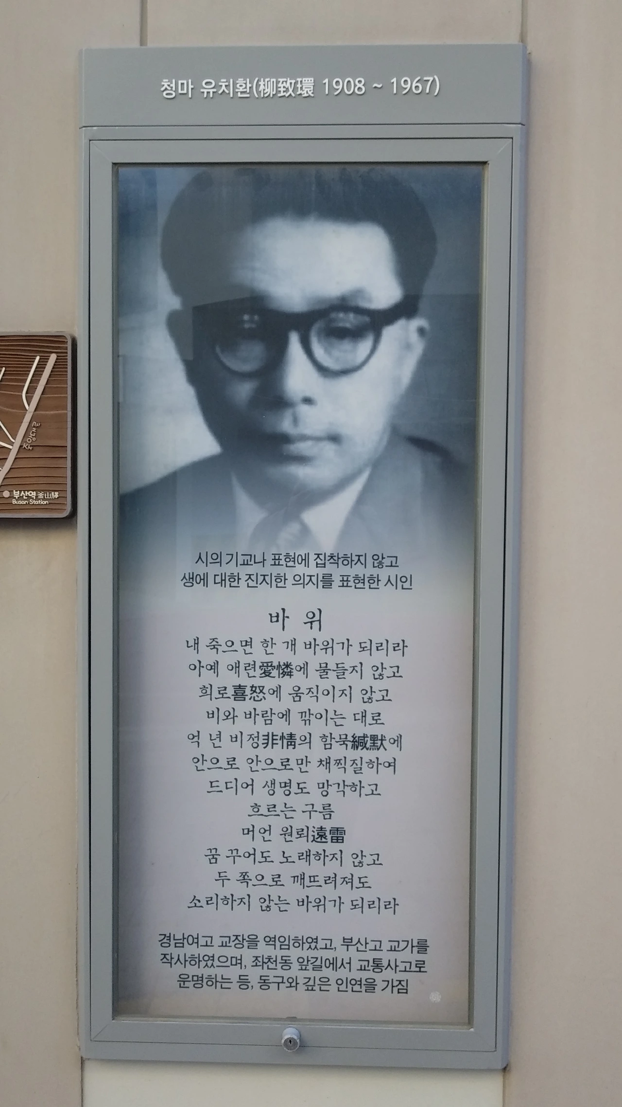 동구 현대 인물사 담장에 게시된 '시인 유치환'과 산복도로 유치환 우체통