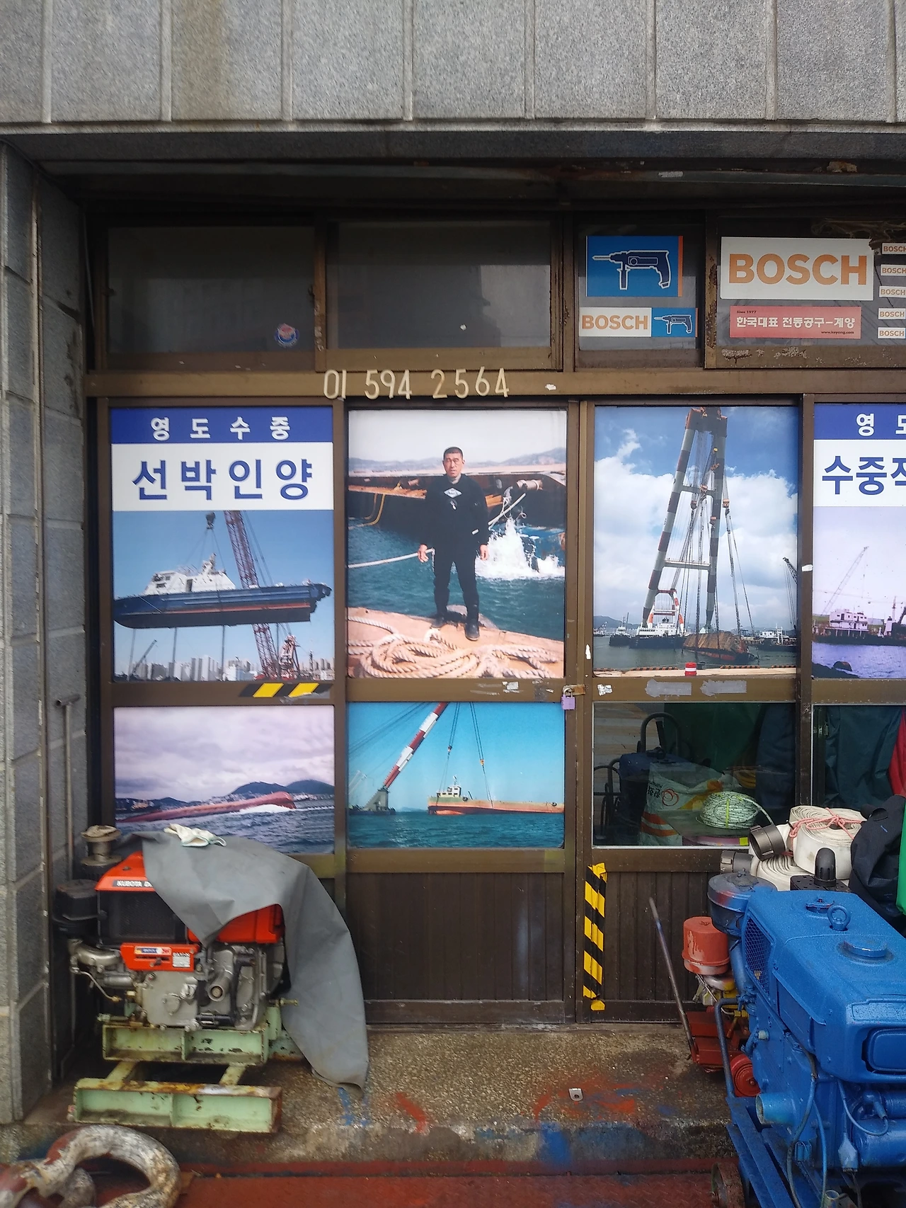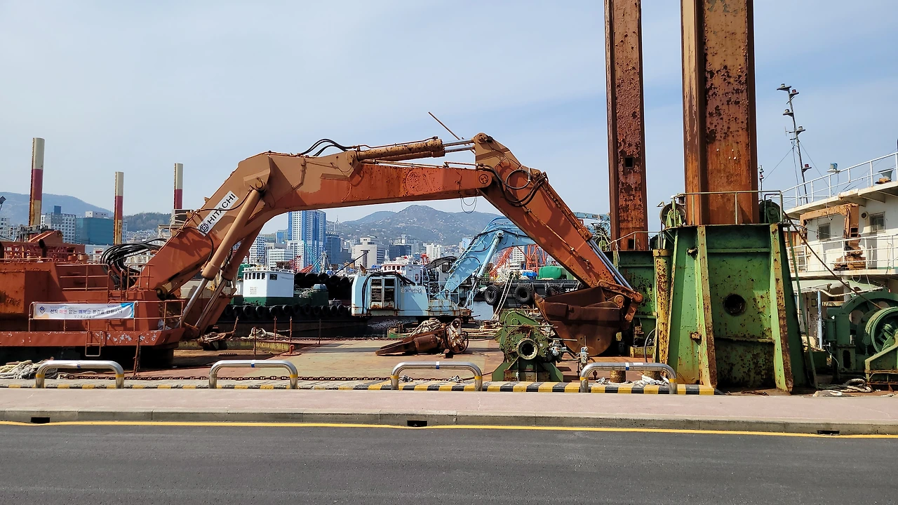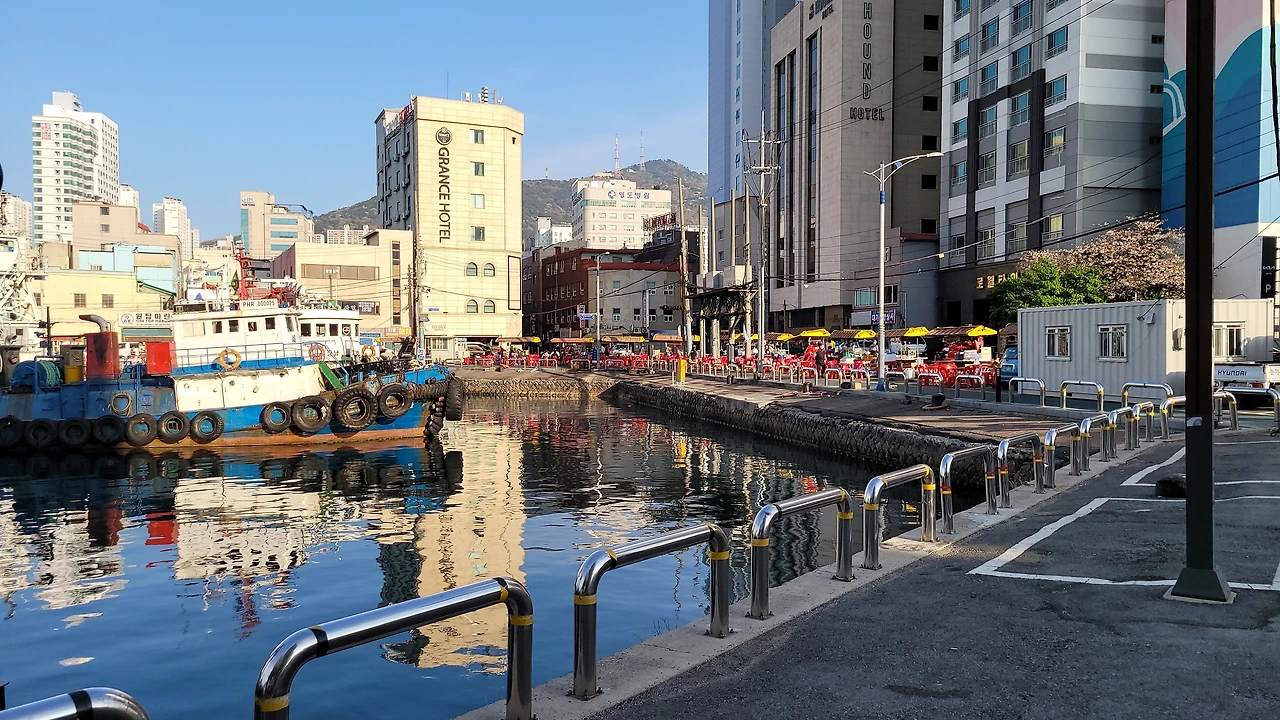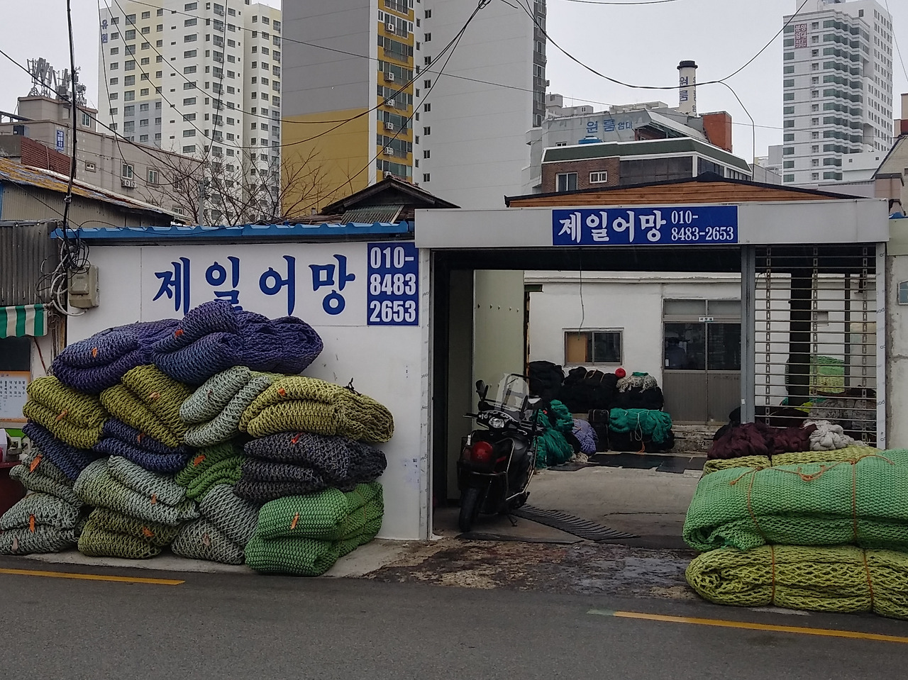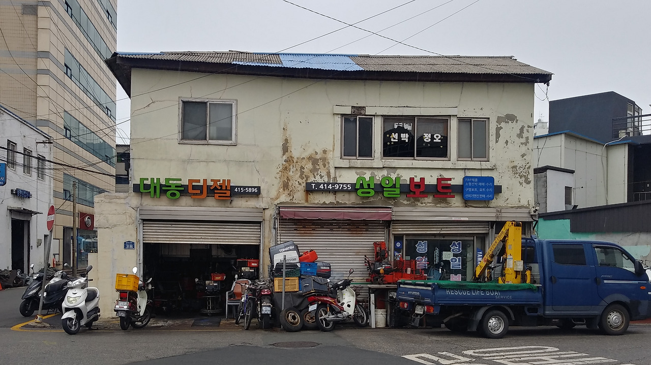 물양장 반대편에는 도로를 따라 선박과 물류 관련 업체들이 모여 있다. 어망, 엔진, 보트, 선박 인양, 수중 작업, 고속화물 등의 회사들이 줄지어 있다. 작고 낡은 건물들과 고층 건물이 함께 섞여 있다.