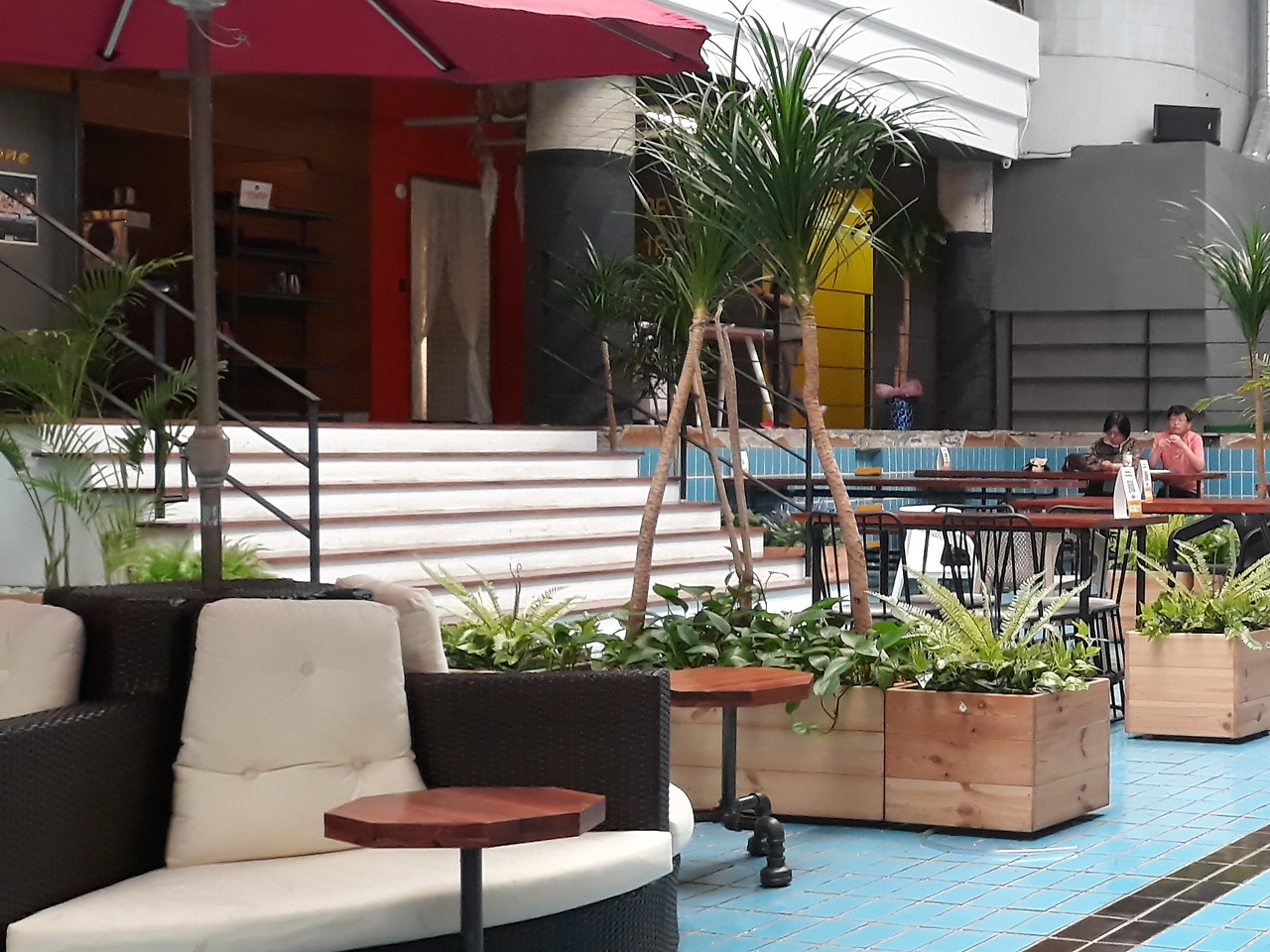 오양대교맨션 1층, 젬스톤. 물만 채우면 수영장이 될 공간이 카페로 새로 태어났다. 바닥의 파란 수영장 타일이 눈에 들어온다. 오랫동안 비어있던 수영장을 재해석한 야심 찬 도시재생 프로젝트의 결과물이다.