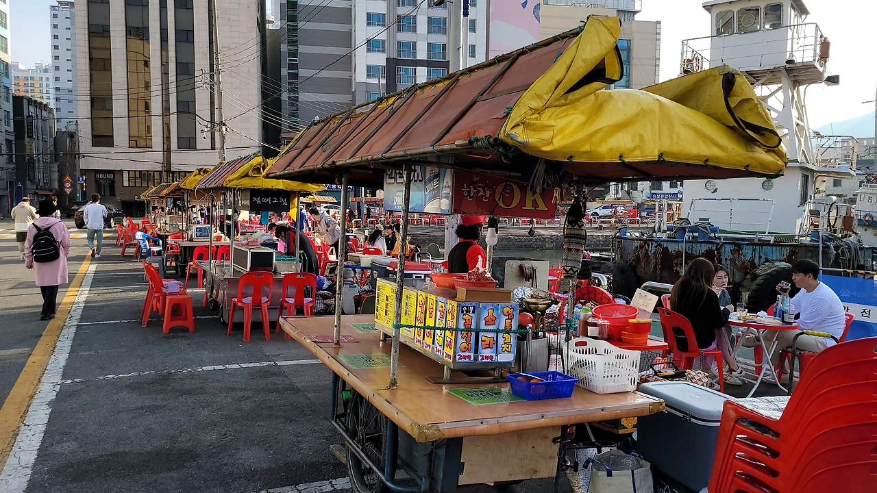 옛 향수를 느끼게 하는 815 다방 앞의 물양장 주변은 포장마차 거리가 된다. 해질녘이 되니 포장마차가 속속 들어와서 영업을 준비한다. 창고 거리 카페에 있던 젊은이들이 자리를 옮겨 앉는다. 영도의 새로운 명물 거리가 되었다.