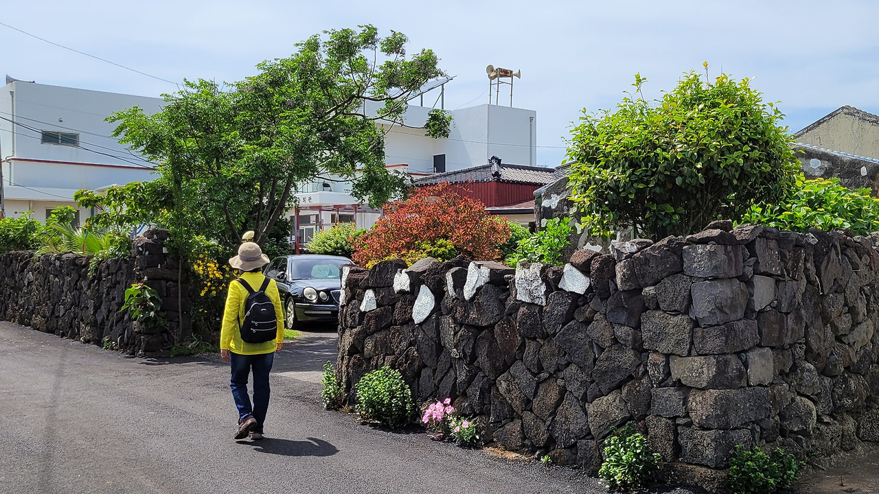 수월봉 기상대의 둥근 건물을 바라보면 밭 사이의 농로를 걷는다. 끝없이 이어지는 마늘밭은 수확철이다. 마늘대를 베어서 밭고랑에 눕혀 놓았다. 한장동 마을회관을 지나간다. 강아지 한 마리가 우리를 보더니 느릿느릿 새소리가 들리는 나무 그늘로 들어간다. 할머니 두 분이 추담 밑에 씨마늘을 말리면서 대화를 하는데 무슨 말을 하는지 한마디도 알아듣지 못하겠다.