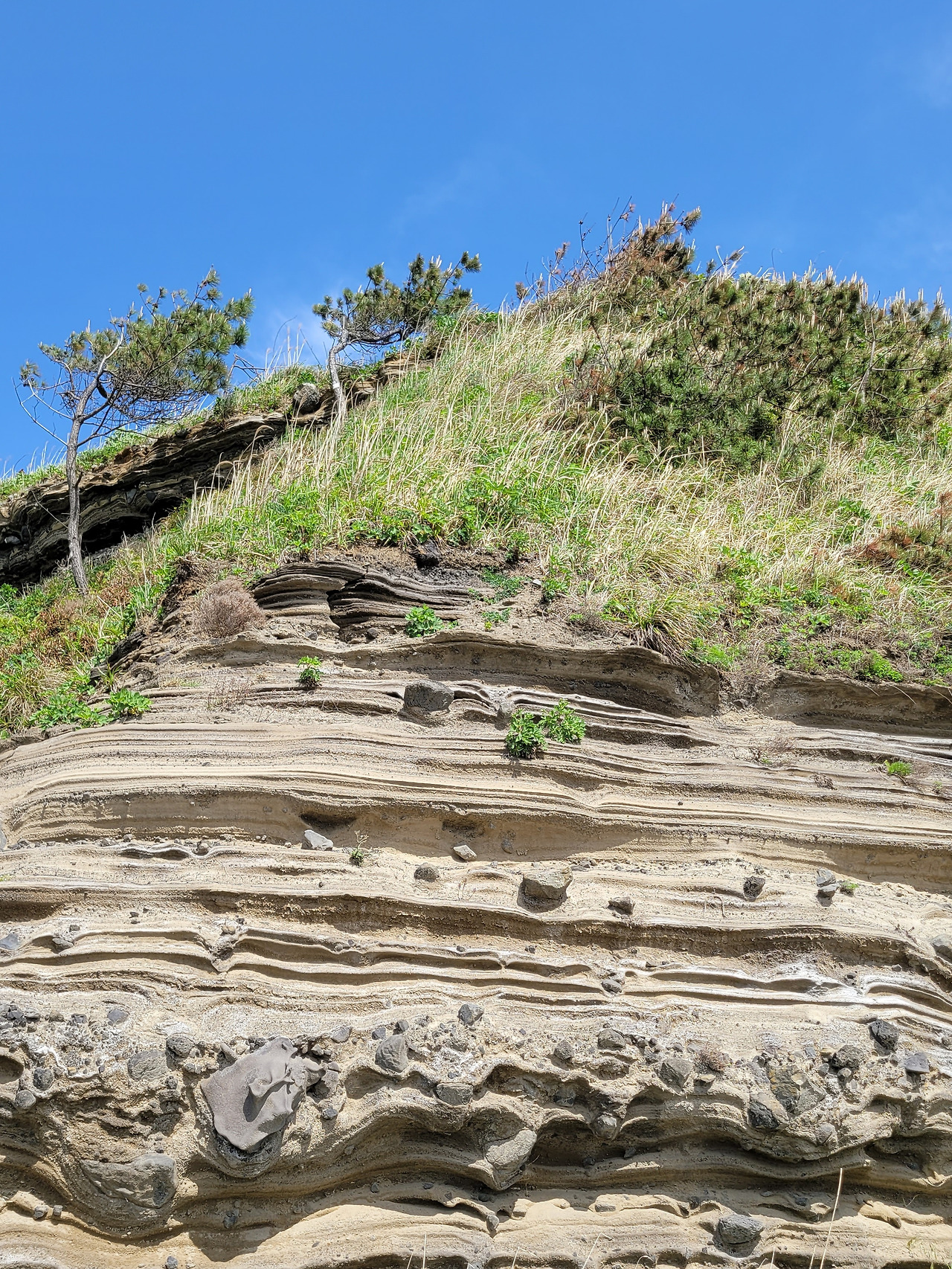 수월봉 해안절벽의 다양한 지층을 보며 걷는다. 수월봉의 또 다른 매력은 해안 풍경이다. 화산 지형의 원형이 잘 보존된 지층이 해안을 따라 길게 드러나 있다.