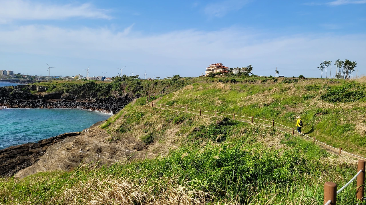 풀밭 사이의 바당길에서 풀밭과 하얀 포말을 일으키며 파도치는 검푸른 바다와 옅은 푸른색의 하늘을 3등분 해 본다.