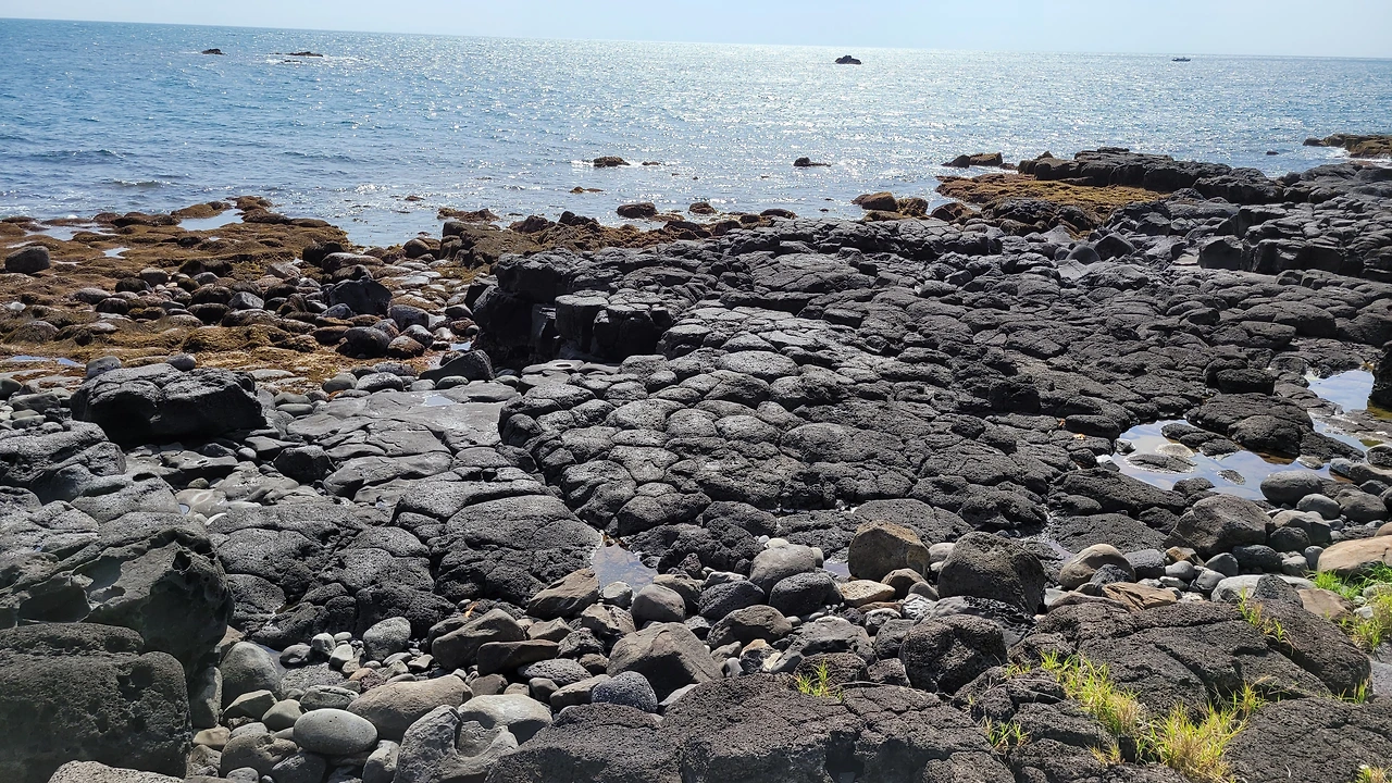 수월봉 해안에는 검은색 용암이 넓게 분포하고 있다. 이 용암은 수월봉 화산재 지층 아래에 놓여 있어, 용암이 먼저 흐르고 그다음에 화산재가 쌓였음을 보여 주고 있다. 표면에는 육각형으로 갈라진 절리가 거북등 모양을 하고 있다.