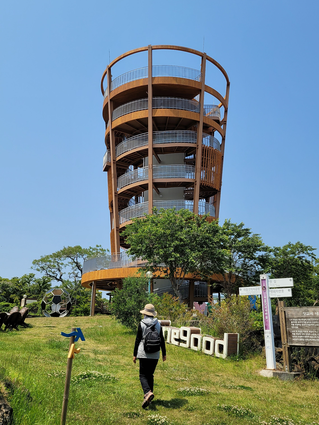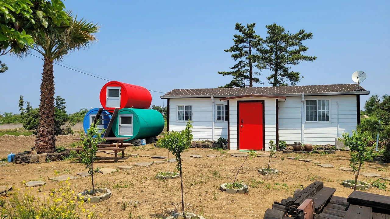 시멘트로 된 농로를 따라가는 지루함을 덜어 주는 볼거리가 나타난다. 하얀 벽에 빨간 대문을 단 깜찍한 집이다. 마당에 이곳이 제주임을 알리는 키 큰 야자수가 서 있다. 커다란 드럼통을 삼각형으로 쌓아 만든 아래채가 있다. 팔강, 파랑, 초록의 원통 모양을 한 집이다. 이렇게도 집을 지을 수 있구나.