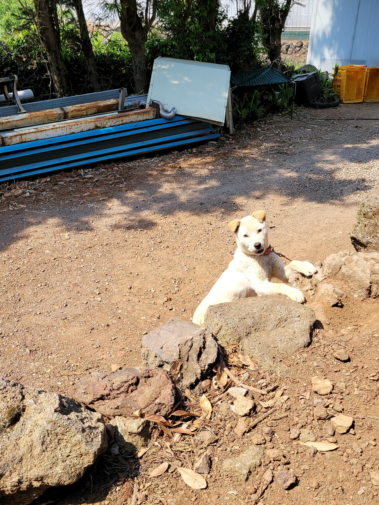 농가는 인적이 없고 강아지가 홀로 집을 지킨다.