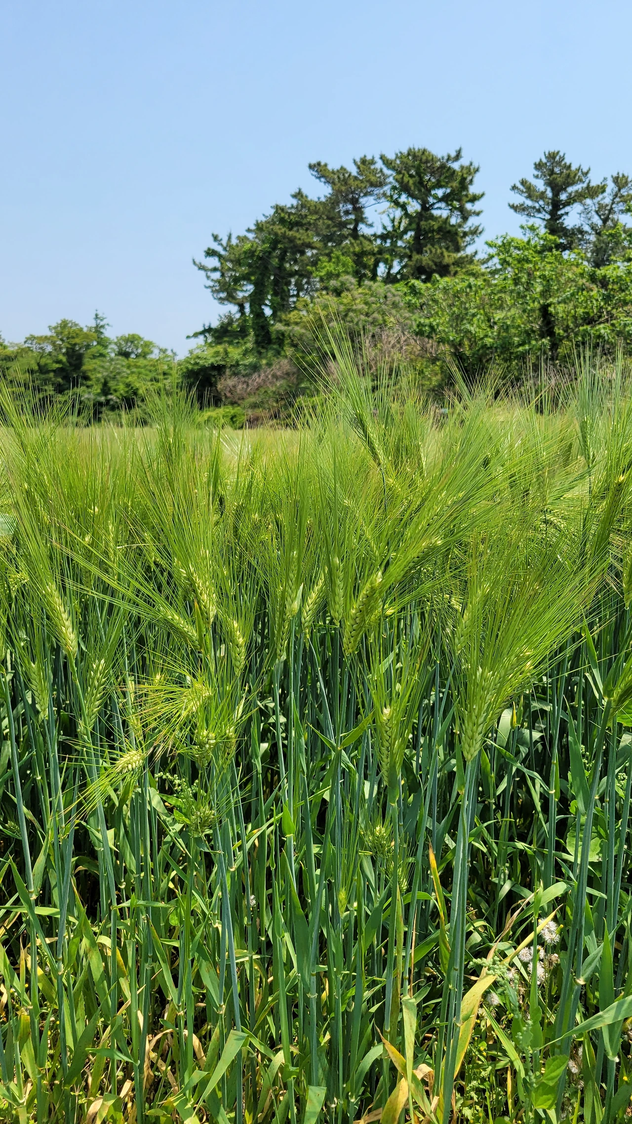 들판의 보리는 다른 지역과 달리 아직 여물지 않았다. 청보리가 바람에 일렁인다.