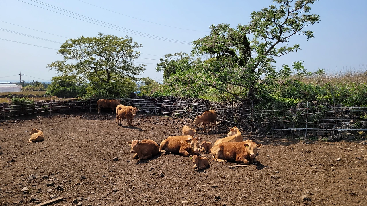돌담이 안내하는 잣길을 지나 화산석이 울퉁불퉁한 까마귀쪽나무 숲을 힘들게 올라가니 길이 넓어진다. 조수리로 들어간다. 소와 말이 한가로이 쉬고 있는 목장이 나오고 400년 된 팽나무 보호수를 만난다.