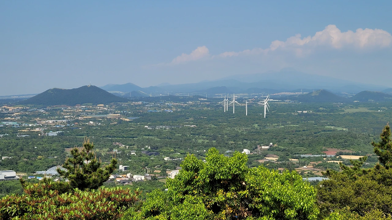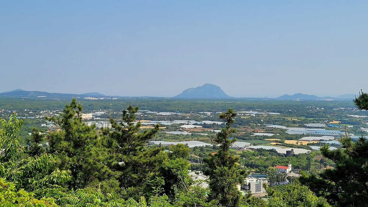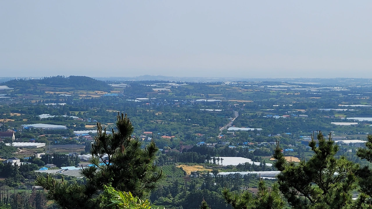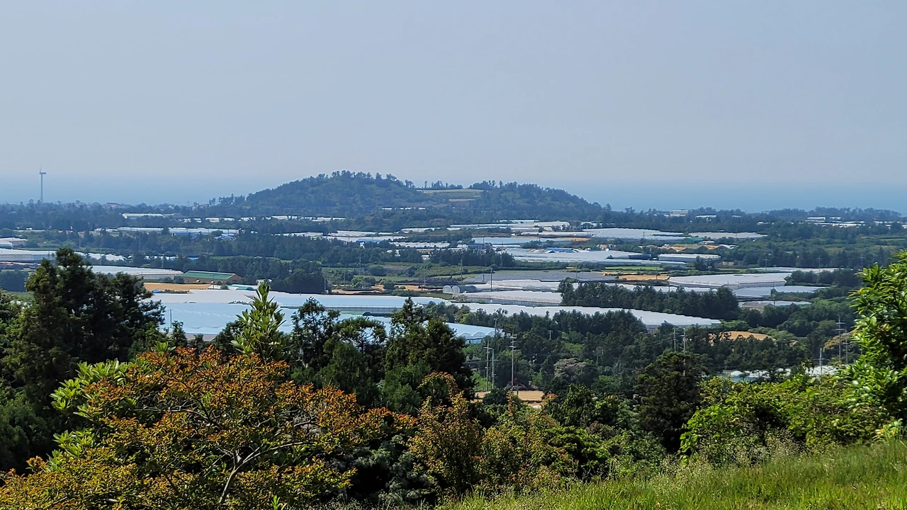 조금 전 전망대보다 고도가 높아졌다. 서쪽 바다가 보인다. 숲 속에 드문드문 집들과 비닐하우스가 보인다. 전형적인 중산간 마을의 풍경이다.