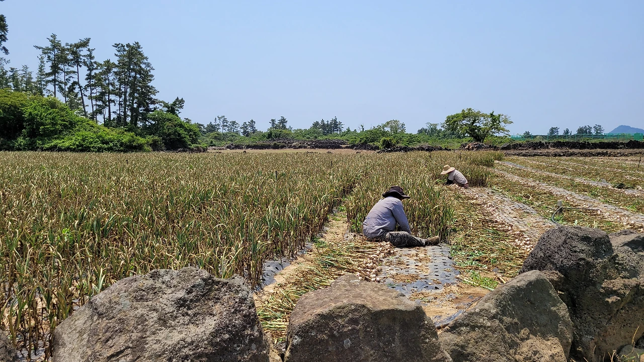 제주올레가 야심 차게 개척한 특전사 숲길이 사유지라 통제된다. 우회하는 길이 아스팔트 길이다. 가장 걷기 힘든 길이 아스팔트 길이다. 작은 숲길을 드나든다. 쪼른 숲길, 고목나무 숲길을 빠져나와 또 콘크리트 포장길로 연결된다. 밭에는 부부가 마늘을 수확하고 있다.