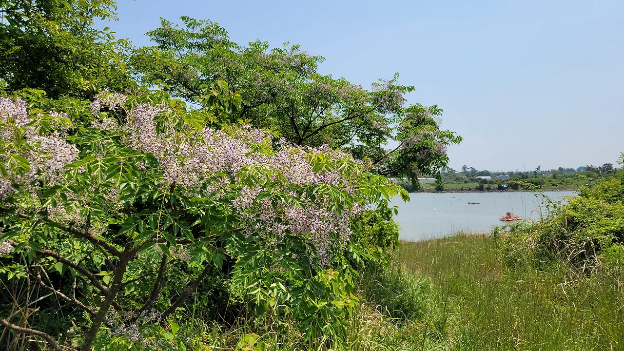 저수지 제방에는 멀구슬나무가 군락을 이루고 있다. 멀구슬나무의 열매는 독성이 있지만 조류에게는 좋다고 알려져 있다. 이 열매의 핵으로 염주나 묵주를 만든다. 또 길섶에는 꿀풀이 진분홍 꽃 뭉치를 달고 올레꾼의 눈길을 끈다. 자그마한 벌노랑이도 보인다. 올레길은 저수지 북쪽을 둘러 지나간다.