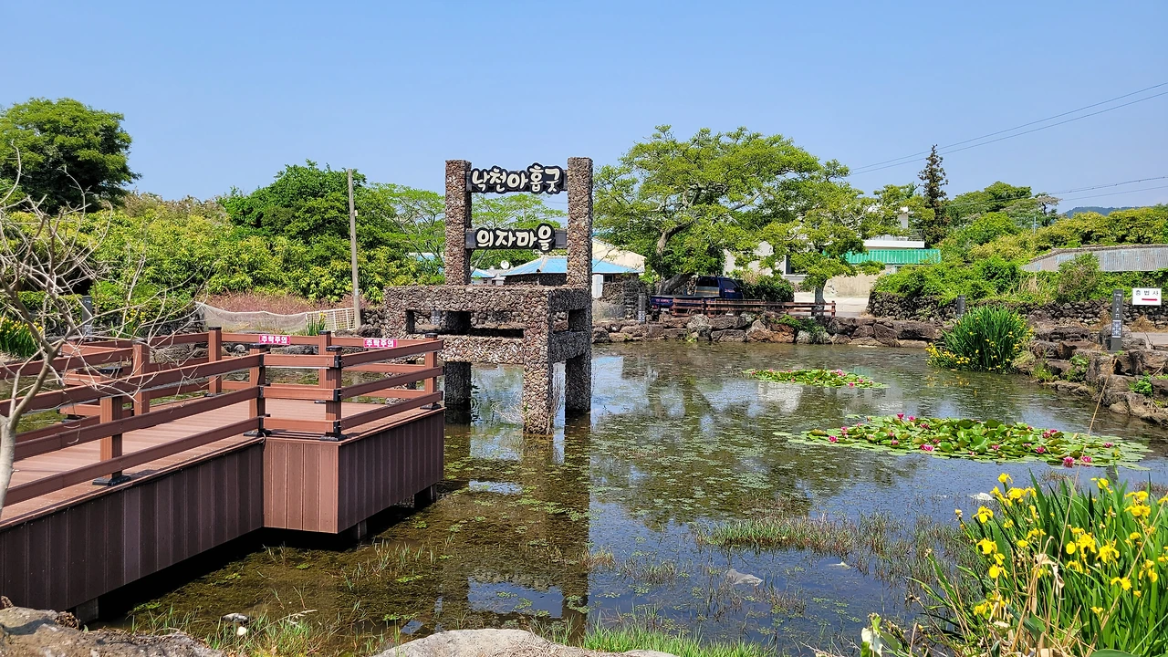조용한 마을 낙천리에 들어선다. 올레 리본은 오거리 로터리에서 낙천리 사무소 쪽으로 바로 가지 않고 연꽃이 피어 있는 작은 연못 옆을 둘러서 들어간다.