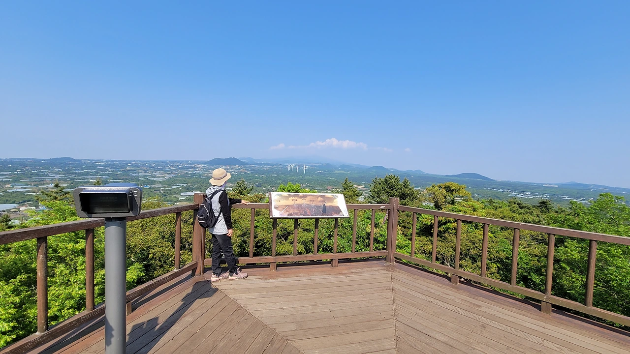 먼저 굼부리 둘레길을 반시계 방향으로 한 바퀴 돈다. 3/4쯤 지나면 전망대가 있다. 느지리오름, 당산오름, 정물오름, 도너리오름, 산방산, 금오름, 돌오름, 대병악, 소병악, 바굼지오름이 보인다.
