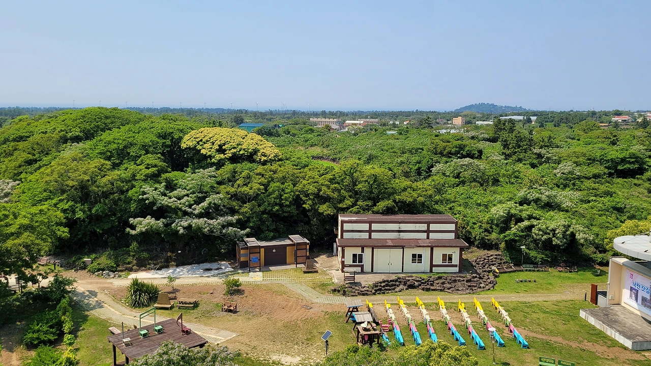 의자공원 전망대에 올라가 주변을 둘러본다. 한경면의 중앙에 위치한 낙천리다. 동쪽으로 저지오름, 서쪽으로 당산봉, 남쪽으로 새신오름, 북쪽으로 판포오름이 둘러싸고 있어 분지 형세를 하고 있다. 작은 곶자왈도 있다.
