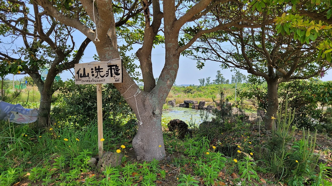 "아홉굿마을은 제주에서 대장간이 처음 생긴 마을입니다. 쇠붙이를 녹여 거푸집에 부으려니 형틀을 만들 흙이 필요했지요. 대장간을 하던 여산 송 씨가 구덩이(굿)를 파서 흙을 사용했어요. 그렇게 해서 생긴 구덩이가 아홉 개라 아홉굿이 되었지요. 그 구덩이에 물이 고여 아홉 개의 연못이 되어 지금도 농업용수로 쓰고 있습니다. 물이 좋은 곳이라 낙천리고요."