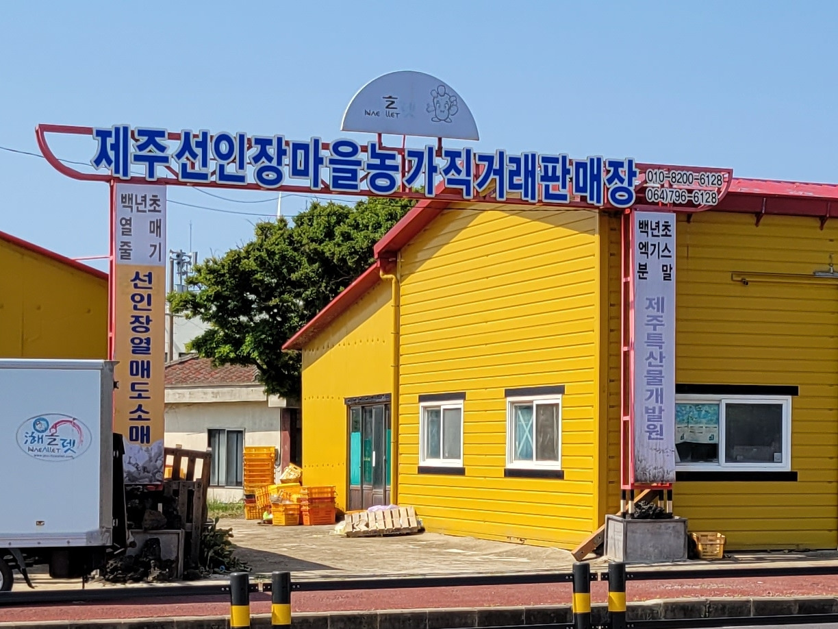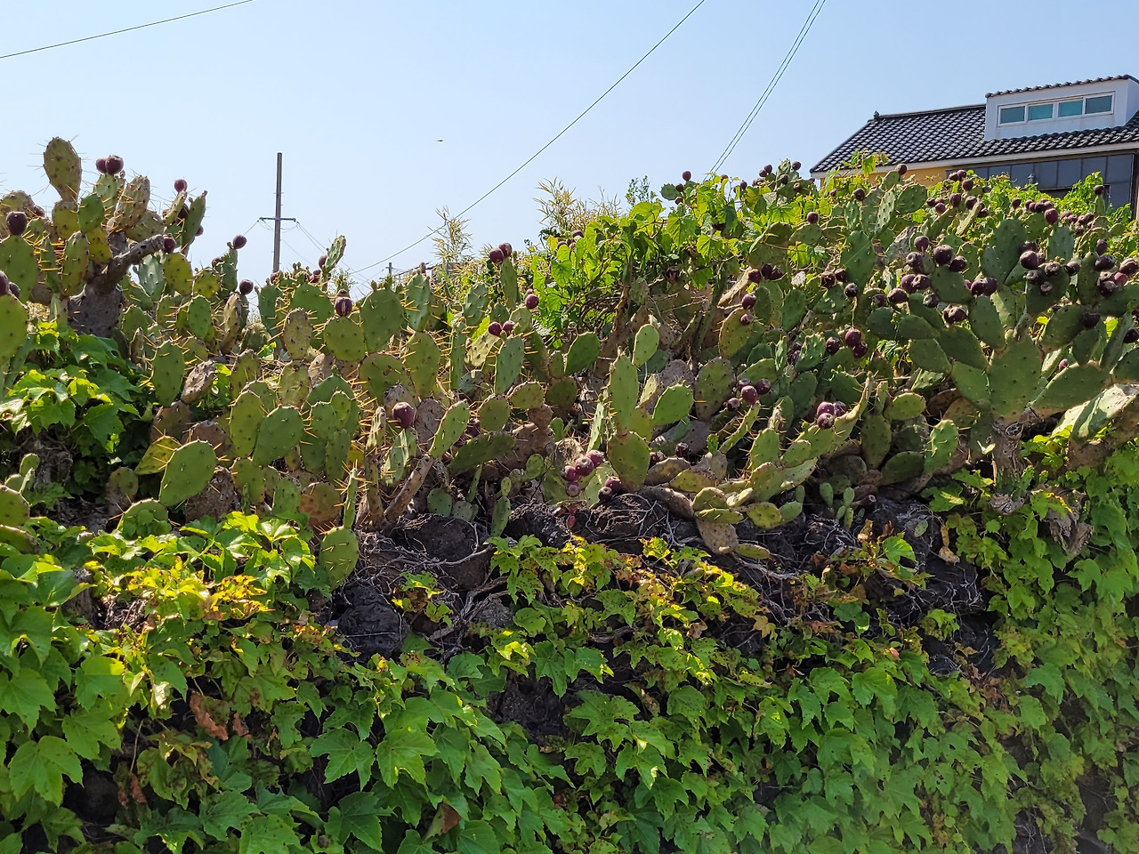월령 삼거리에서 일주서로를 건넌다. 월령리 마을에 들어서니 밭과 들, 가정집 마당과 울타리가 온통 선인장으로 뒤덮였다. 또 크고 작은 백년초 가공업체들, 직거래 판매장도 보인다. 펜션 이름도 월령선인장이다.