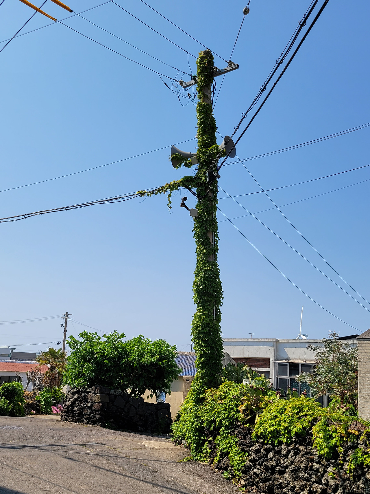월령리 복지회관을 지나간다. 마을소식을 알리는 스피커가 회관 앞 전봇대에 달려있다. 담쟁이덩굴이 자신의 꽃말처럼 '성실'하게 전봇대를 타고 오른다. 거의 꼭대기까지 올라갔다. 전선도 타고 간다.