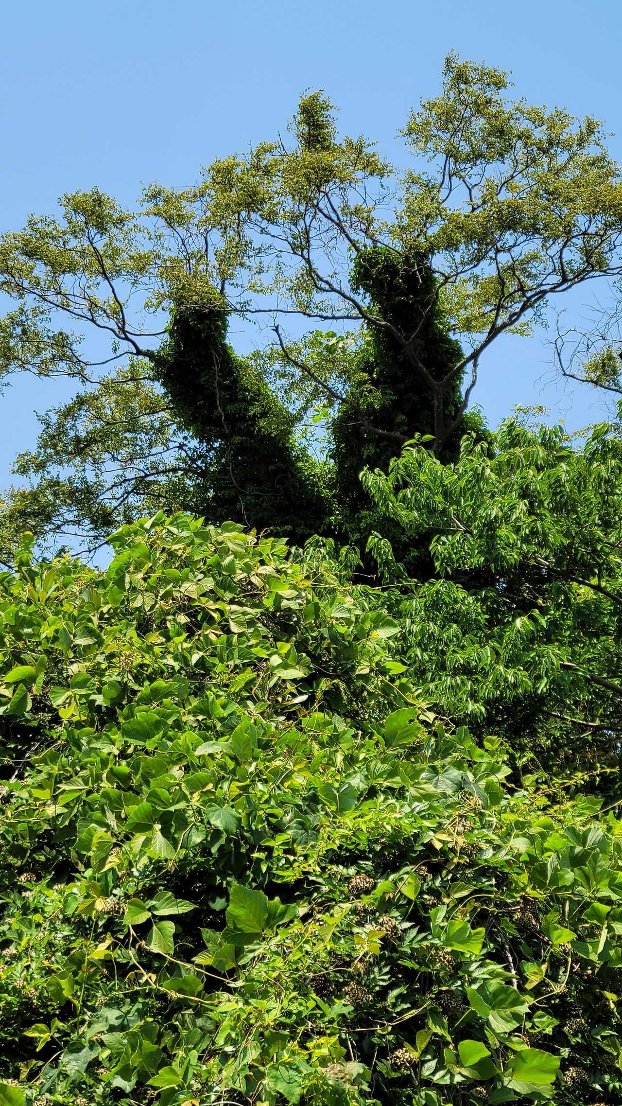높은 키를 자랑하듯 언덕 위에 올라서서 자라는 멀구슬나무를 칡넝쿨이 감아 오른다. 나무 전체를 뒤덮고 있다. 매 두 마리가 마주 보고 앉아 있는 형상을 하고 있다.
