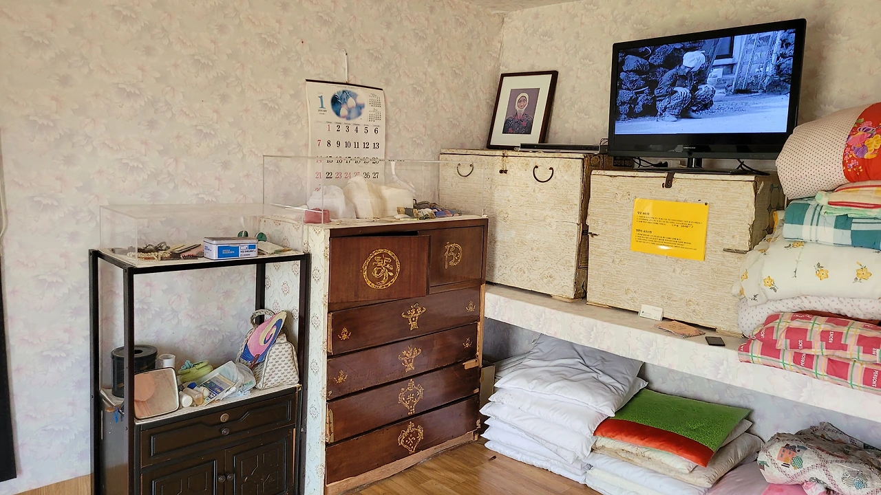 생전에 쓰시던 주방도구와 옷가지, 침구류 등 세간살이들이 그대로 보존되어 있다. 젊었을 때 모습을 포함한 사진 액자가 여러 개 벽에 걸려 있다. 달력은 2001년 1월에 멈추어 있다.