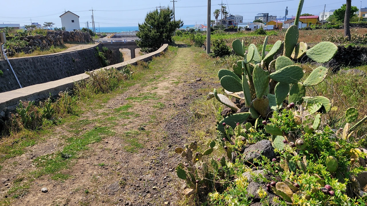 월령 선인장 마을. 올레는 또다시 하천의 좌우로 다리를 넘어 넘나 든다. 어느새 해변이 눈앞으로 다가오고, 선인장 농장이 이어진다.