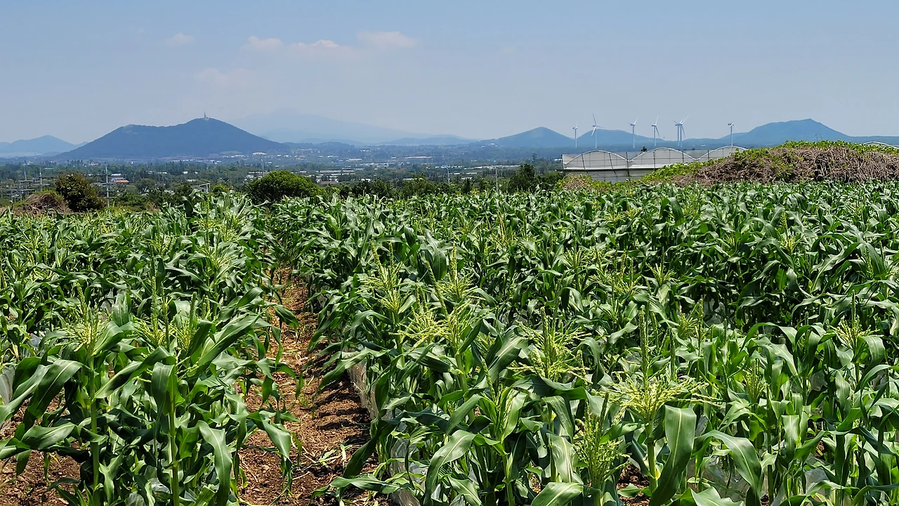 현무암으로 감싸인 밭에는 옥수수가 자라고 있다. 아직 키가 나지막하다. 뒤로 풍차 해안과 오름들이 둘러서 있다.