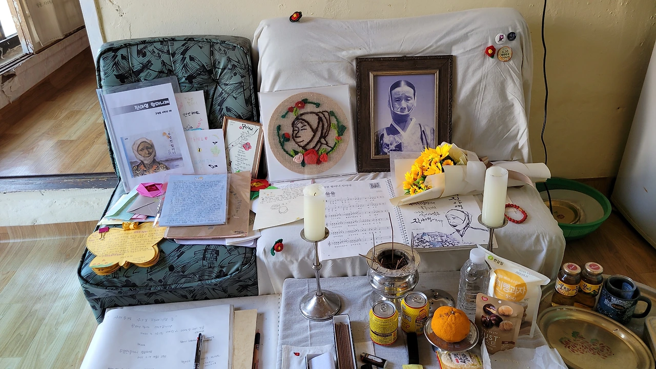 방으로 들어서니 고 진아영 할머니 영정 앞에 국화꽃이 놓여 있다. 추모곡 악보와 다녀간 이들이 남긴 편지가 탁자 위에 놓여 있다. 할머니 드시라고 놓고 간 식혜와 꿀 홍삼, 꿀 매실, 밀감, 과자들도 보인다.