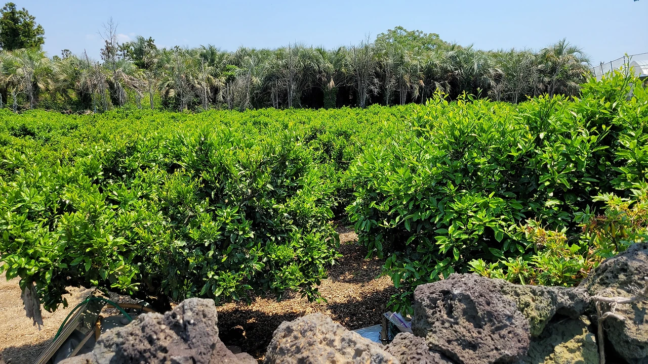밭담길. 오른쪽으로는 제주지역 특유의 밭담길이 이어진다. 밀감 밭과 돌담, 그 뒤로 야자수 숲이 병풍처럼 둘러서 있다. 들판과 숲이 이어지는 저지고망숲길을 지난다. 농로를 지나는데 들판의 중간중간에 이어지는 숲이 곶자왈 못지않다.