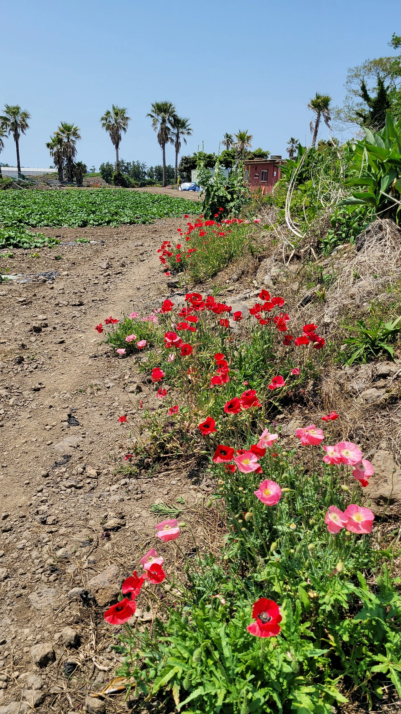 나지막한 초원에 구부러져 난 길을 넘어서니 개양귀비가 요염하게 핀 농가가 있다.