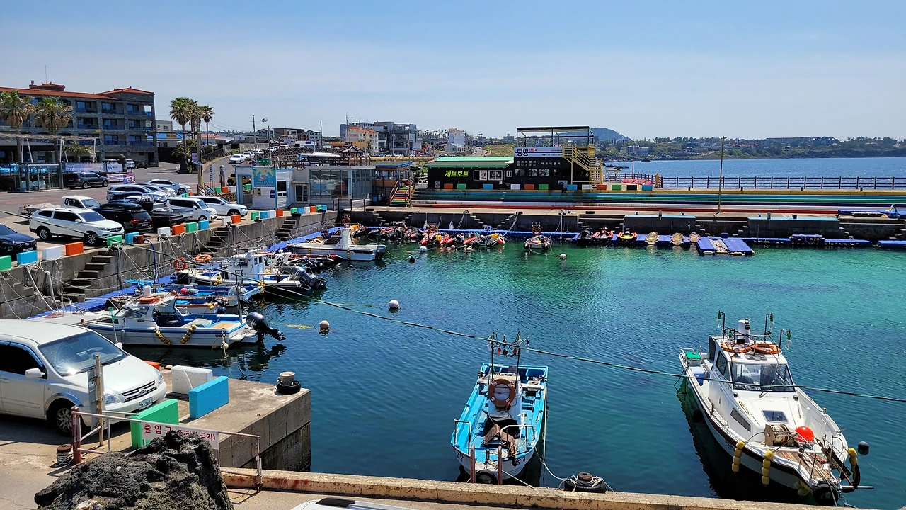 구엄리가 소금빌레로 유명세를 떨치는 관광지라 포구도 작은 시골 어항을 넘어 관광지 분위기가 난다. 'ㄷ'자로 잘 정비된 선착장은 어선이 주로 정박하고 있지만, 한켠으로는 제트보트가 관광객을 기다리고 있다. 전기 자전거, 미니 스쿠터 대여 업소도 보인다.